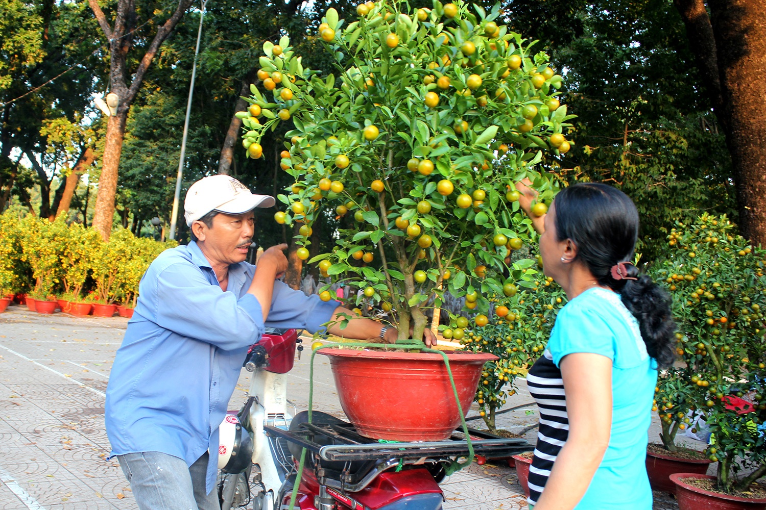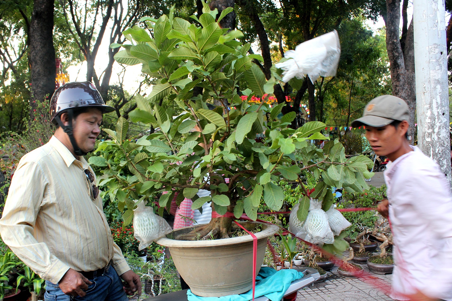 | Tại chợ hoa công viên Gia Định, dòng kiểng cây ăn trái trồng chậu thu hút khá nhiều người mua. Những cây ổi, xoài có chiều cao 50-60 cm nhưng trĩu quả được bán với giá 450.000-1.000.000 đồng một cây. |