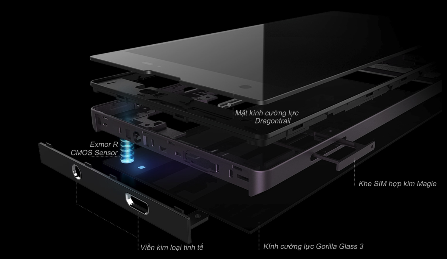 Mặt trước, để bảo vệ và giúp bề mặt cảm ứng hoạt động mượt mà, là kính Dragontrail, sản xuất bởi Asahi Glass (thuộc tập đoàn Mitsubishi). Thương hiệu kính này nổi tiếng với sự mỏng, nhẹ nhưng khả khăng chịu va đập và chống trầy xước rất tốt.