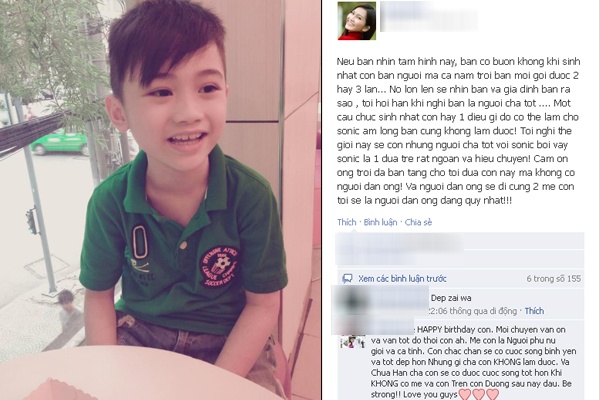Một câu chúc sinh nhật con hay một điều gì đó có thể làm cho Sonic ấm lòng bạn cũng không làm được. Tôi nghĩ thế giới này sẽ còn những người cha tốt với Sonic bởi vậy Sonic là đứa trẻ rất ngoan và hiểu chuyện. Cảm ơn ông trời đã ban tặng cho tôi đứa con này mà không có người đàn ông. Và người đàn ông sẽ đi cùng mẹ con tôi sẽ là người đàn ông đáng quý nhất".