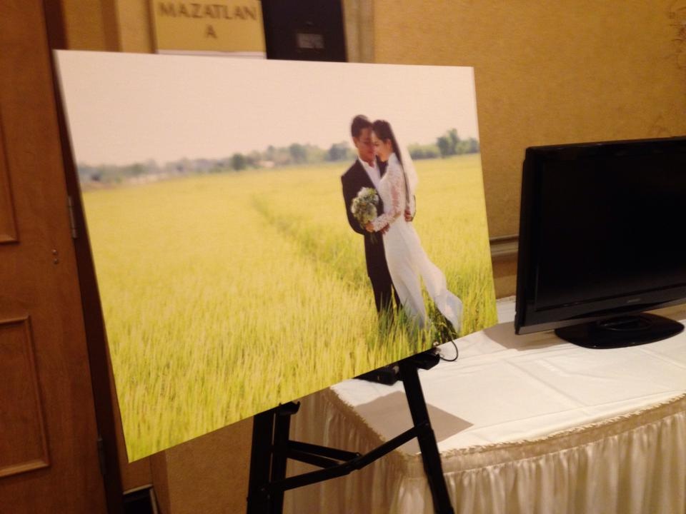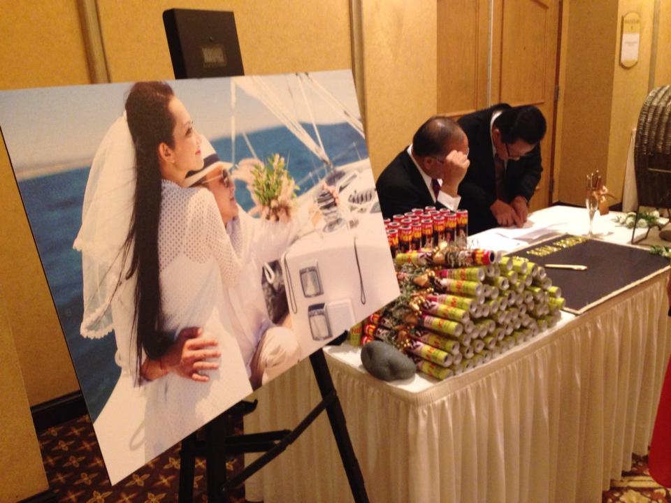 Tiệc cưới của diễn viên Kim Hiền và chồng được tổ chức tại một khách sạn lớn tại Mỹ với những nghi thức theo đúng truyền thống người Việt. Ngoài sảnh, hình cưới của đôi vợ chồng được đặt trang trọng cạnh bàn đón tiếp khách mời.
