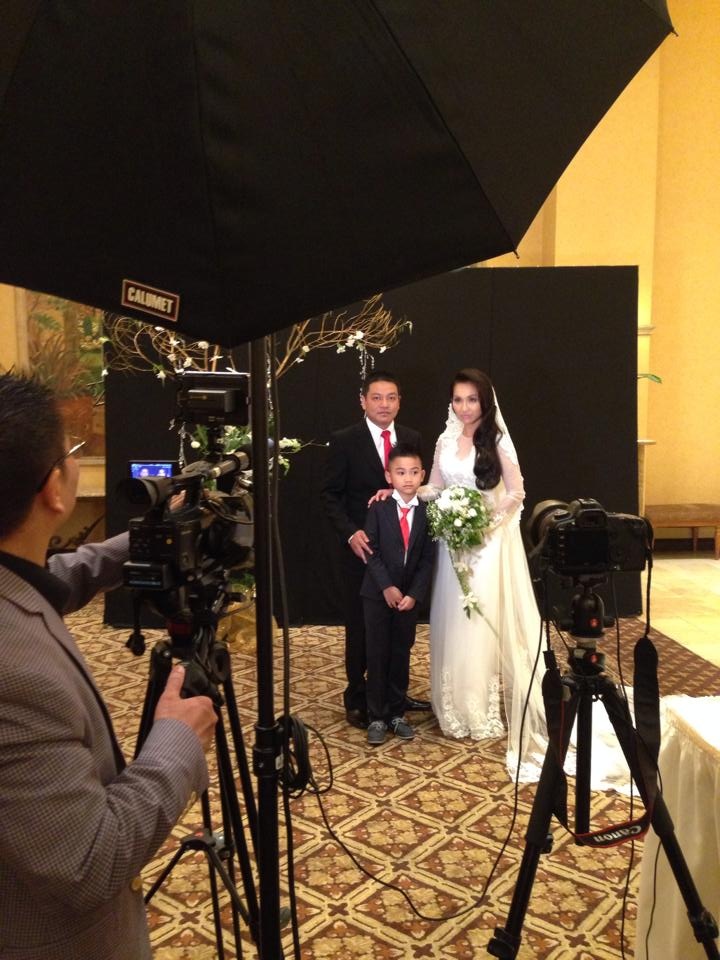 | Trước giờ đón tiếp khách mời, gia đình nữ diễn viên còn chụp ảnh kỉ niệm tại sảnh tiệc. Cô dâu duyên dáng trong bộ đầm cưới màu trắng tinh khôi. Chú rể và con trai Sonic bảnh bao, lịch lãm trong bộ vest tối màu. |