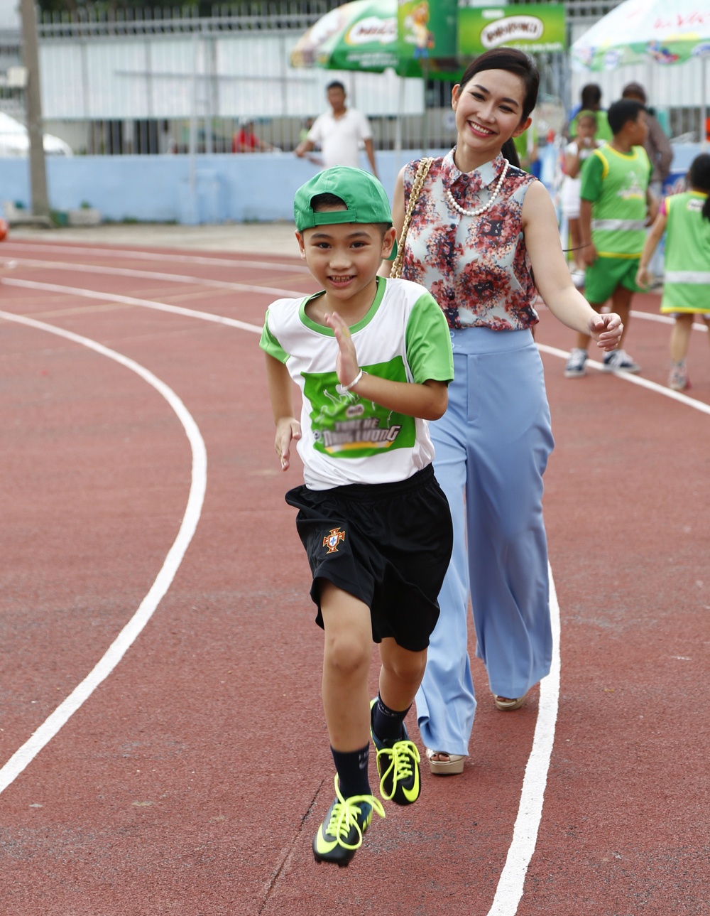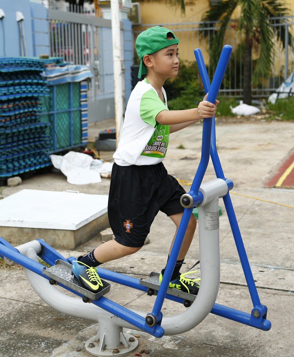 | Kim Hiền hào hứng cùng con trai trước khi bắt đầu tham gia các hoạt động rèn luyện thể lực. |