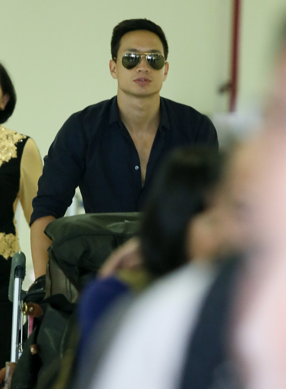 | Đôi tình nhân của Hương Ga đều diện trang phục đơn giản, trẻ trung và đeo kính đôi. Sau khi lấy hành lý, hai người đứng ở sảnh sân bay chờ xe riêng đến đón. |