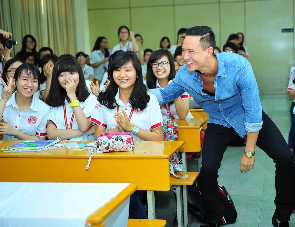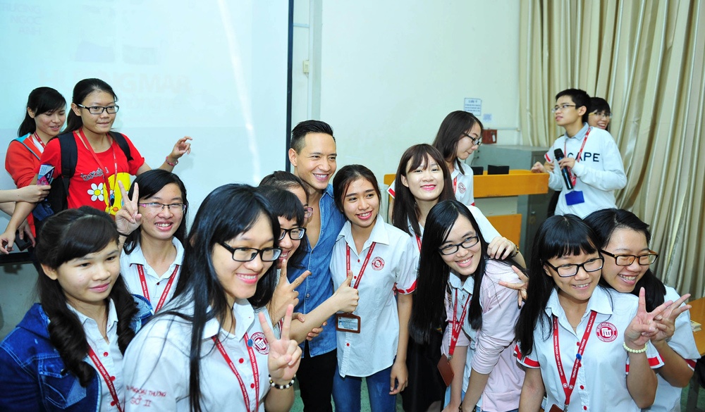 | Anh thể hiện sự gần gũi khi xuống tận hàng ghế sinh viên chụp hình chung. |