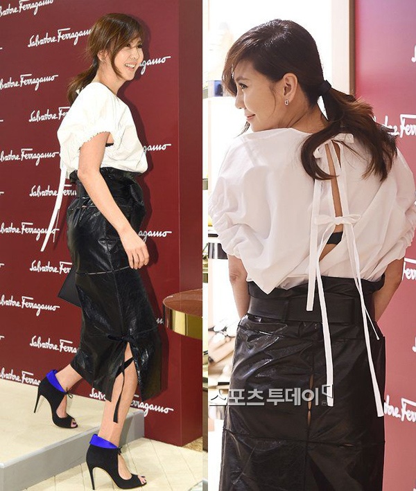 Hôm 26/2, Kim Nam Joo dự sự kiện của một nhãn hàng do cô là gương mặt đại diện. Người đẹp màn ảnh Hàn xuất hiện với trang phục trắng đen gồm áo sơ mi tay phồng phối bèo, chân váy da bóng. |