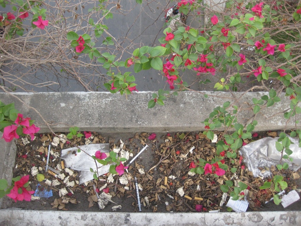 Tại bồn trồng hoa cầu vượt cũng có nhiều kim tiêm của con nghiện...