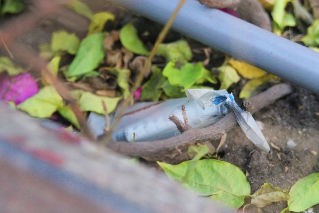 Nhiều góc cầu có gần 10 kim tiêm, trong đó có cây vẫn còn máu ở đầu ống. Người dân sống quanh cho biết ngày nào họ cũng thấy con nghiện ngồi chích ma túy ngay trên cầu giữa trưa.