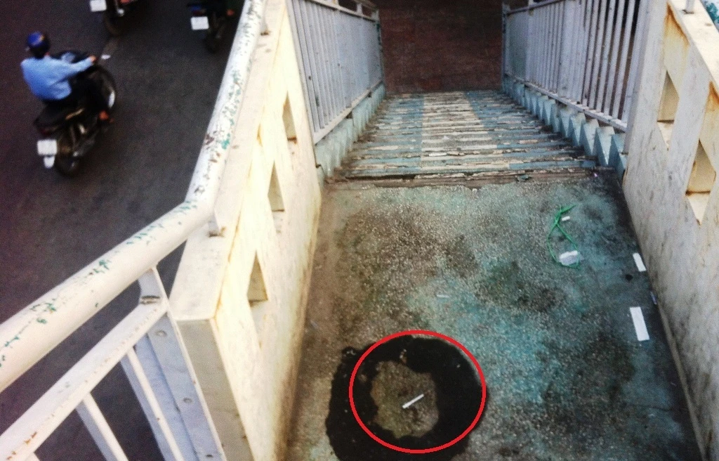 | Gần khu vực 2 thanh niên nghiện ngập trên "hành nghề" là cầu vượt dành cho người đi bộ qua đường Nơ Trang Long. Cây cầu này rất nhếch nhác và trở thành địa điểm tiêm chích của dân nghiện. Trong ảnh: Một kim tiêm bị bỏ lại cầu vượt sau khi con nghiện sử dụng xong. |