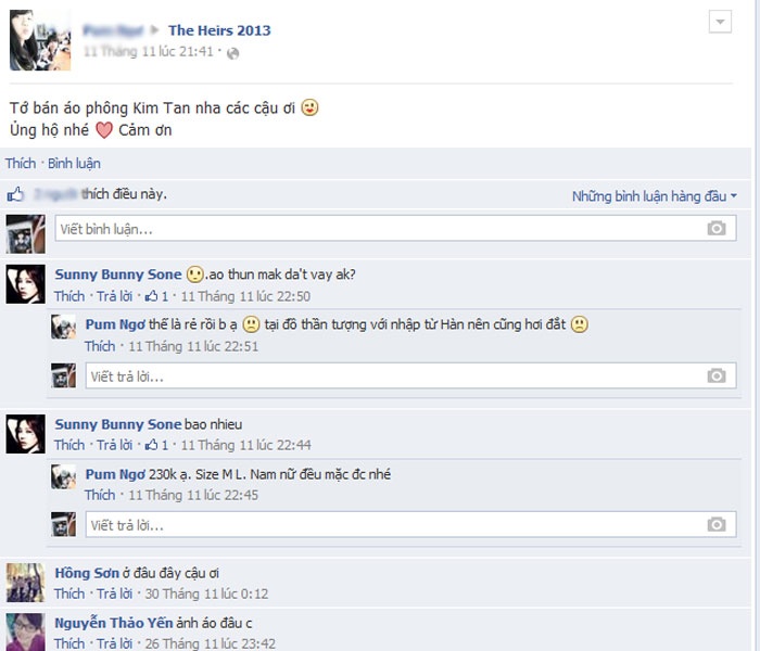 “Mình bán áo phông Kim Tan, 230K mỗi chiếc”, Pum Ngo rao trên trang cá nhân. Với mức giá được comment là khá cao cho một chiếc áo phông nhưng Pum Ngo vẫn tiêu thụ được lượng hàng lớn vì “đó là áo của thần tượng, chưa kể nhập từ Hàn về nên giá cũng hơi đắt”, cô bạn giải thích.