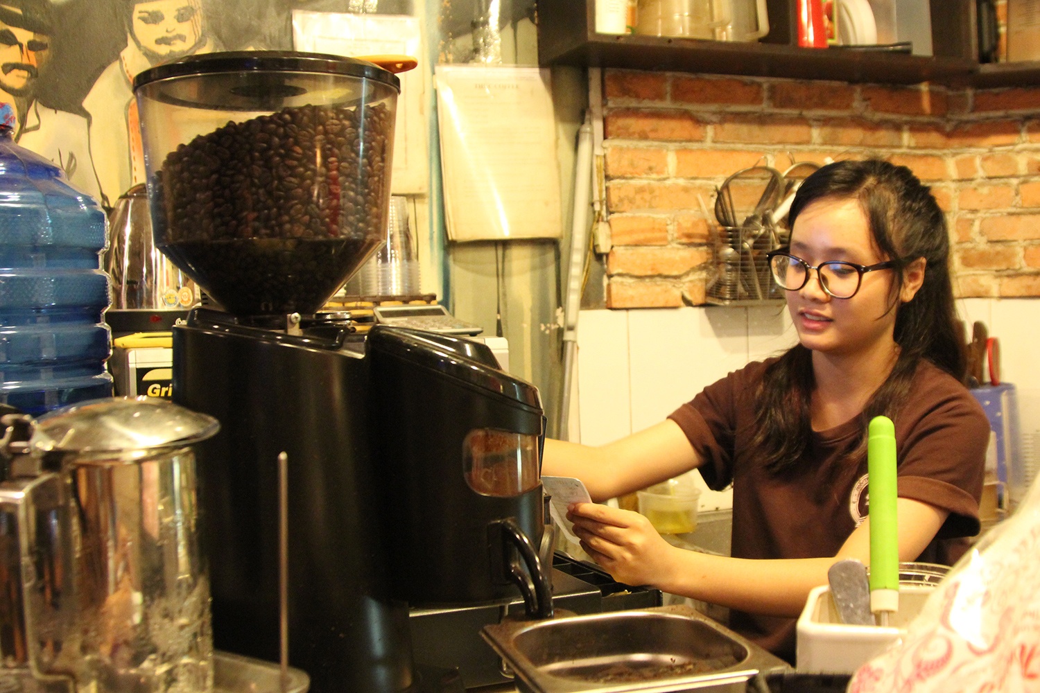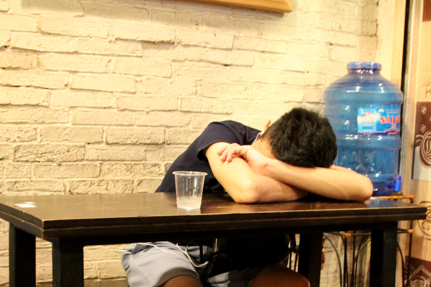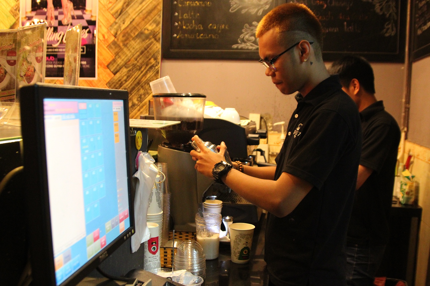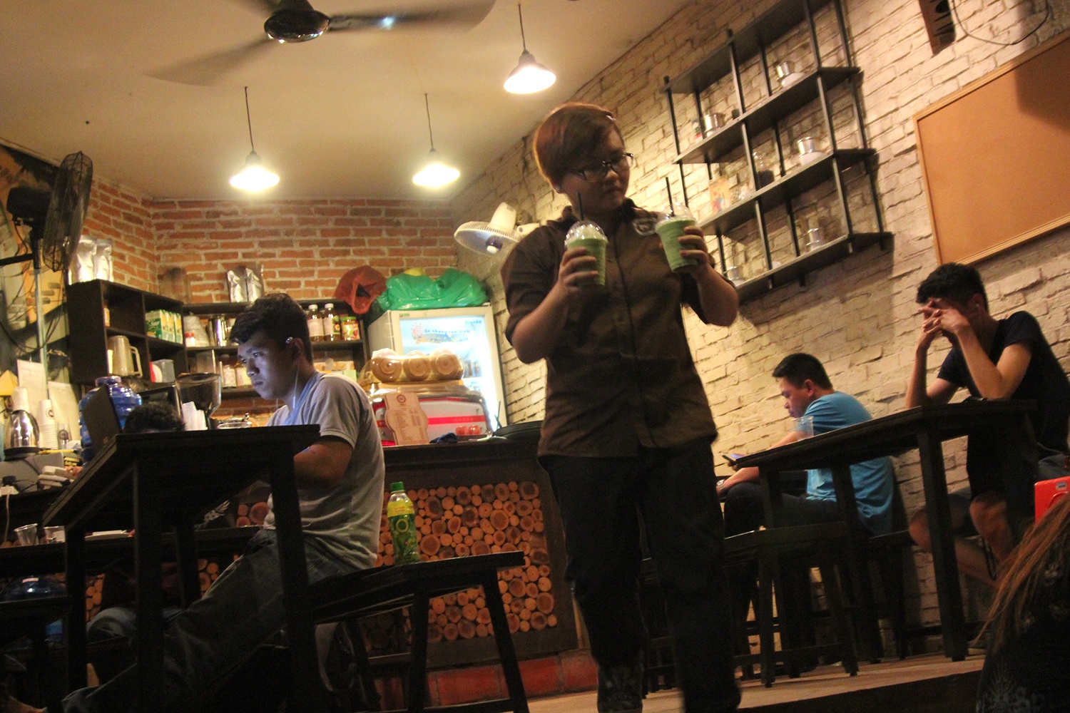 | Nhân viên phục vụ cho các quán cà phê này chủ yếu là các bạn sinh viên làm thêm, họ phải thức thâu đêm để làm việc. Duyên, sinh viên năm 2 một trường công nghệ, cho biết: "Công việc của mình bắt đầu từ 20 h đến 7h sáng hôm sau. Phải mất hơn 1 tháng mình mới thích nghi với việc thức đêm. Rất khó có thể tranh thủ chợp mắt tại quán vì lúc nào cũng đông khách". |