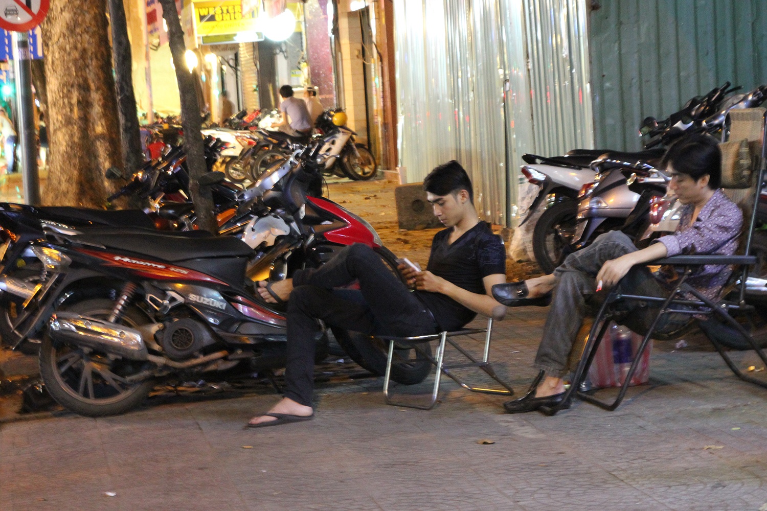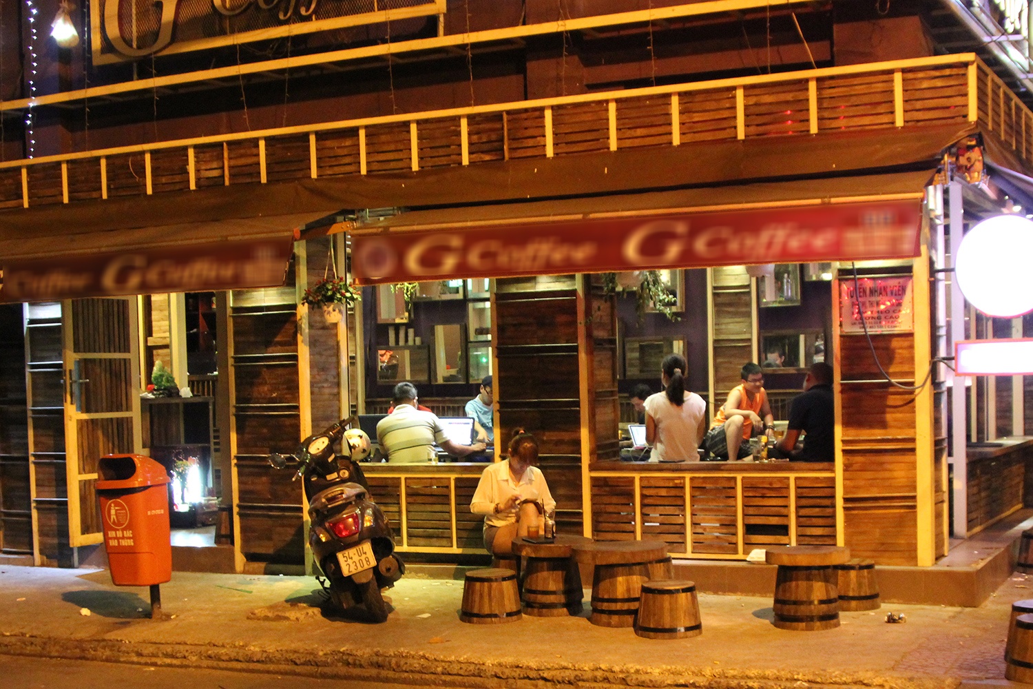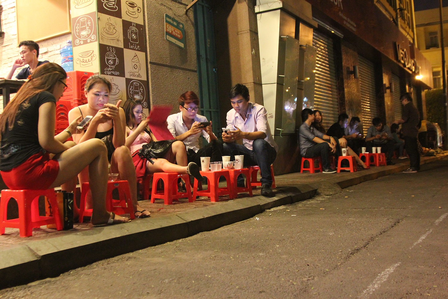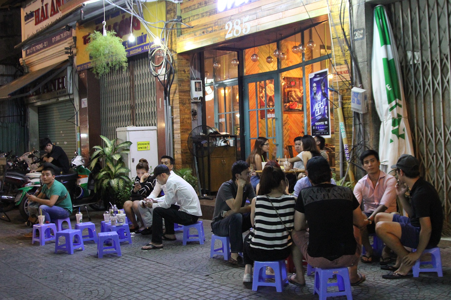 | Dù ban đêm, nhưng nhiều khách không thích không khí bên trong quán mà la cà cùng bạn bè với những chiếc ghế nhựa ngoài vỉa hè. Càng về khuya, quán càng trở nên rôm rả. Thanh, một sinh viên năm 3 cho biết: "Vào dịp cuối tuần hay những khi rảnh rỗi, tụi em thường tìm đến những quán cà phê đêm như thế này để họp mặt đến 3-4h sáng mới về. Thú vị nhất là được ngắm một Sài Gòn vắng lặng, khác hoàn toàn với sự ồn ào náo nhiệt ban ngày". |