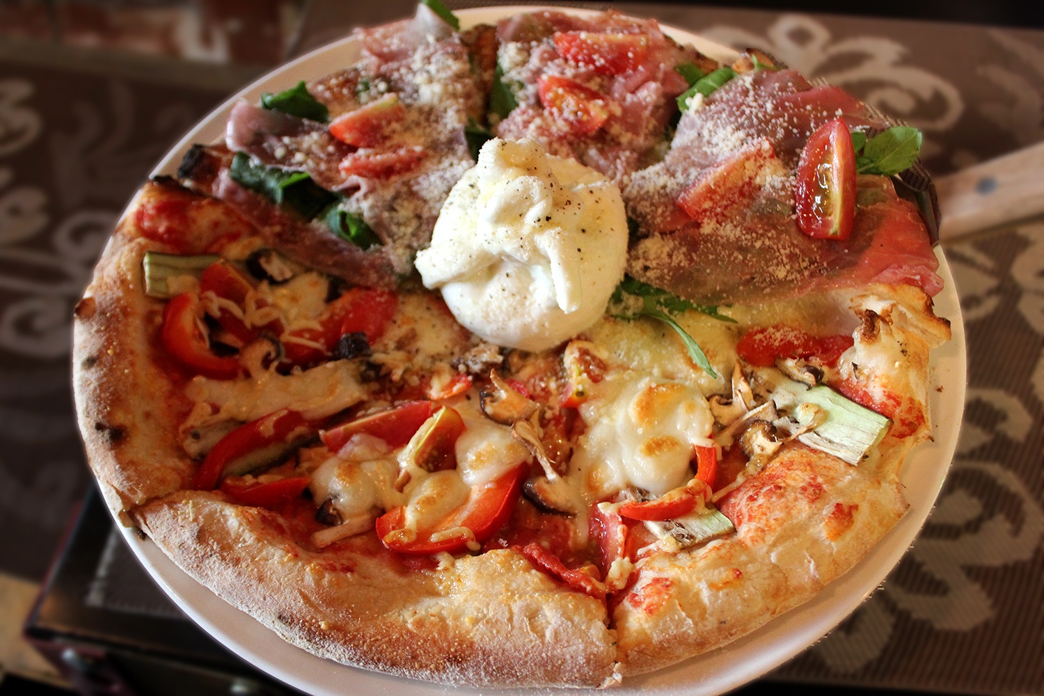 | Pizza ở đây có kích thước trung bình 24 cm. Điểm đặc biệt là trên cùng một chiếc bánh, khách hàng có thể lựa chọn 2 vị khác nhau, và có cả bánh chay. |