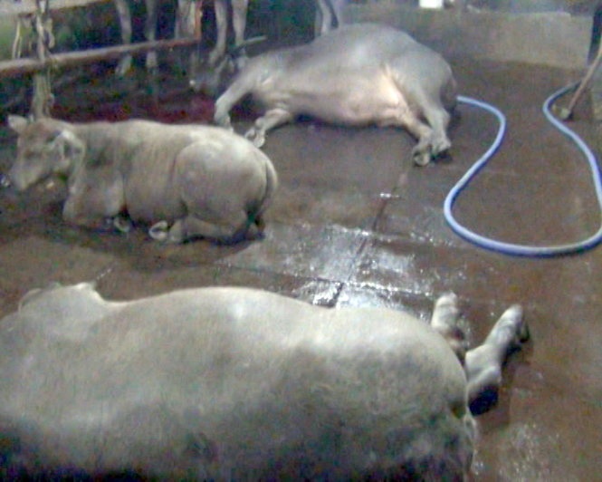| Những con trâu bị bơm nước quá nhiều khiến chúng ngã lăn kềnh tại cơ sở giết mổ của ông Minh ở Bến Cầu, Tây Ninh. Ảnh: Tuoitre. |