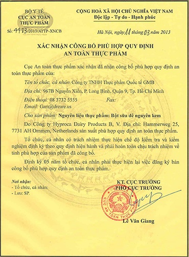 3. Giấy chứng nhận công bố sản phẩm bột sữa dê GmB đạt tiêu chuẩn của Cục An toàn thực phẩm - Bộ Y tế Việt Nam.