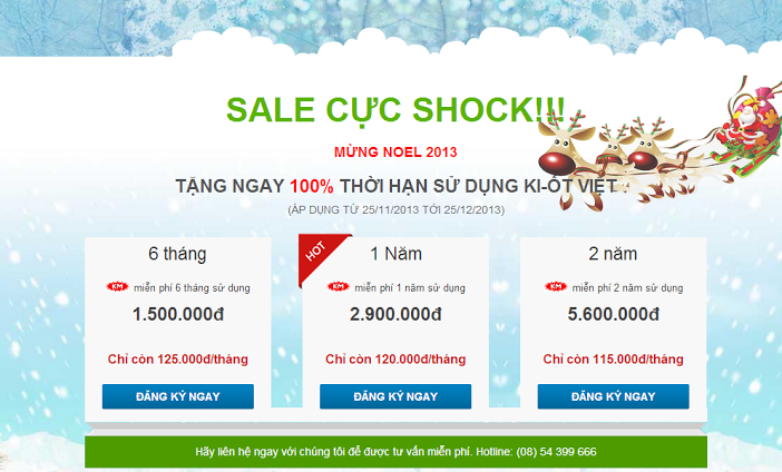 Như lời tri ân dành cho khách hàng đang sử dụng, cùng khách hàng quan tâm tới sản phẩm, phần mềm bán hàng Ki-ốt Việt trân trọng gửi tới khách hàng chương trình ưu đãi đặc biệt nhân dịp Noel 2013: Tặng ngay 100% thời hạn sử dụng Ki-Ốt Việt cho các hợp đồng ký mới và gia hạn từ ngày 25/11 tới 25/12.