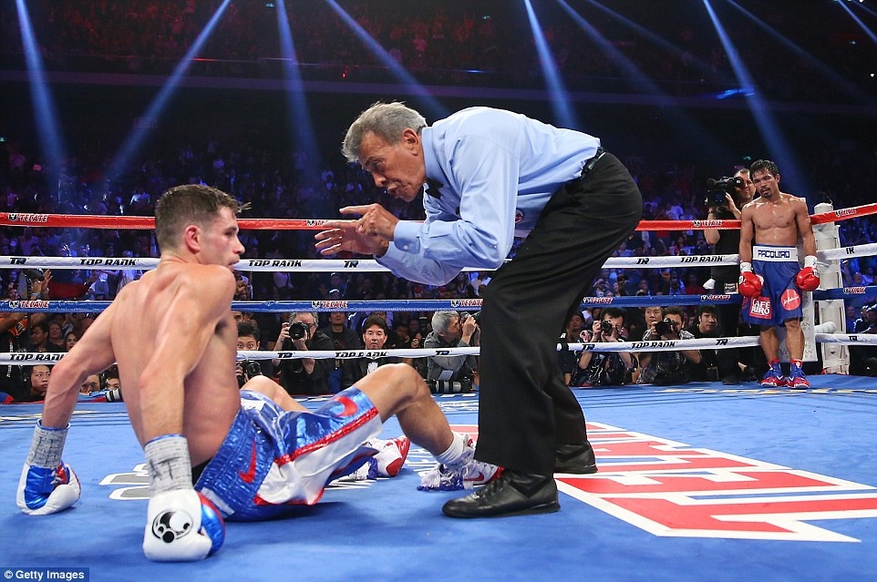 | Hiệp 6, có tới 2 lần Algieri ngã xuống sàn đấu sau những cú móc phải chuẩn xác của Pacquiao.