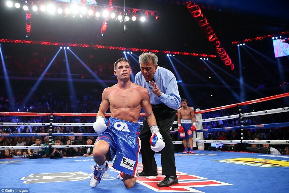 | Dù khá choáng vàng sau những cú knock-out song Algieri vẫn nỗ lực thi đấu đến phút chót. |