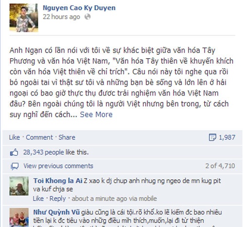 Nguyễn Cao Kỳ Duyên đã đăng tải trên trang cá nhân một status dài chia sẻ quan điểm của cô về văn hóa Việt Nam ngày hôm nay. Theo đó, cô chỉ ra một yếu điểm lớn của văn hóa người Việt: thói quen chỉ trích. Qua câu chuyện của mình và của minh tinh Angelina Jolie, người đẹp bày tỏ hy vọng người Việt sẽ thay đổi cách suy nghĩ riêng.