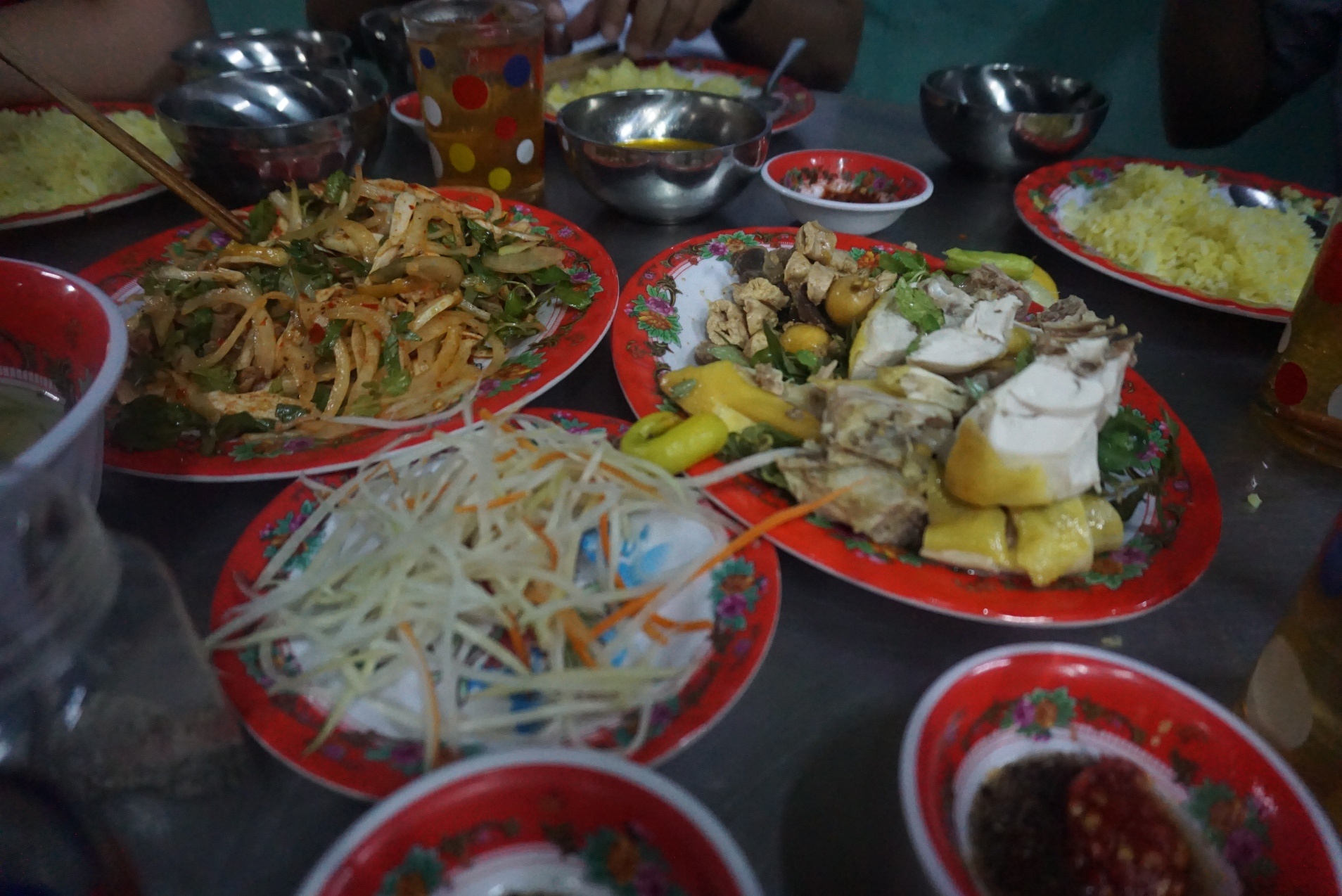Thịt gà ta luộc chín tới, thơm dai, da gà mỏng giòn tan. Nước luộc gà pha bột nghệ dùng để nấu cơm giúp cơm có vị béo ngậy, thơm ngon, màu vàng tươi hấp dẫn. Mỗi ngày, chị Nhung anh Bình bán hết 40 con gà luộc, 7 nồi cơm (mỗi nồi cơm nầu từ khoảng 6 kg gạo). Thu nhập hàng ngày khoảng 15 triệu đồng từ gà, chưa kể cơm và các món ăn, uống bán kèm. Để đủ gà bán mỗi ngày đồng thời đảm bảo chất lượng đồ ăn bán ra, vợ chồng anh chị mở trang trại nuôi gà riêng tại xã Hòa Phước (Hòa Vang, Đà Nẵng). Gà được chọn có cân nặng 2 – 2,4kg, thịt thơm, chắc.