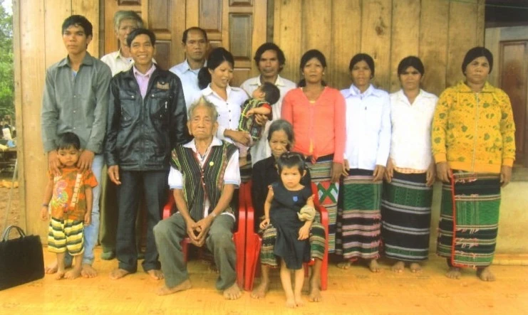 | Cụ ông Y'N Dông ngồi ghế bên trái cùng vợ và con cháu. |