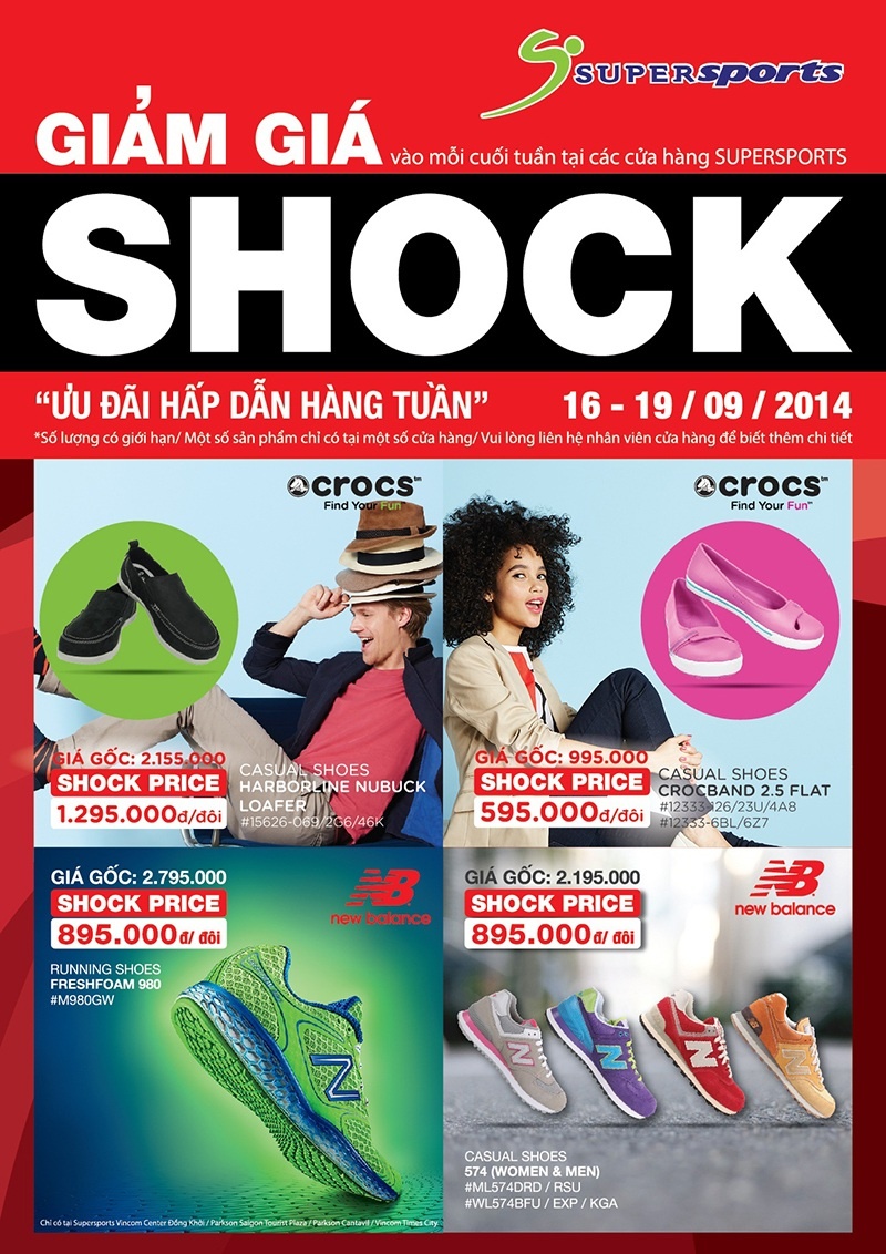 Đến ngay cửa hàng Supersports vào mỗi cuối tuần để khám phá các ưu đãi tuyệt vời từ các thương hiệu bạn yêu thích, như Crocs, New Balance, FILA và nhiều hơn nữa. Hãng sẽ cập nhật liên tục hằng tuần các ưu đãi trên các kênh truyền thông chính, khách hàng theo dõi Facebook, Instagram và website Supersports để không bỏ lỡ các cơ hội này. Trong tuần đầu, 16-19/10, Crocs Harborline Nubuck Loafer, Crocband 2.5 Flat, New Balance Fresh Foam 980, New Balance 574, Fila Speedweave Run 2.0 sẽ là những sản phẩm giảm giá lớn.