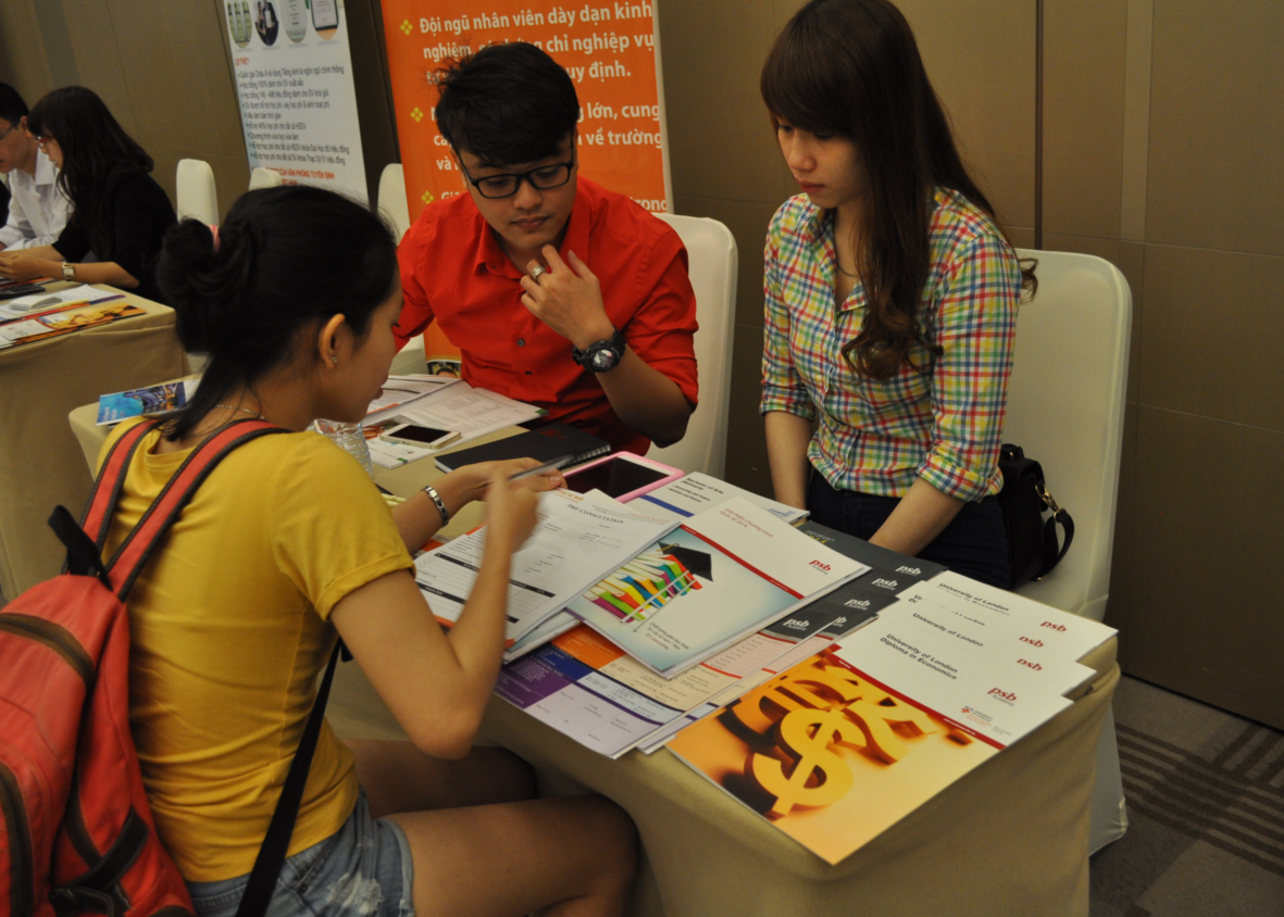 Các tư vấn viên của PSB Academy Singapore đã giải thích cho phụ huynh, học sinh những lợi ích thiết thực khi chọn trường làm nơi du học. "Nếu như tại Việt Nam, học sinh vào đại học phải thi tuyển thì các nước khác trên thế giới và trong cùng khu vực là áp dụng hình thức xét tuyển, trong đó có PSB", một tư vấn viên giới thiệu.