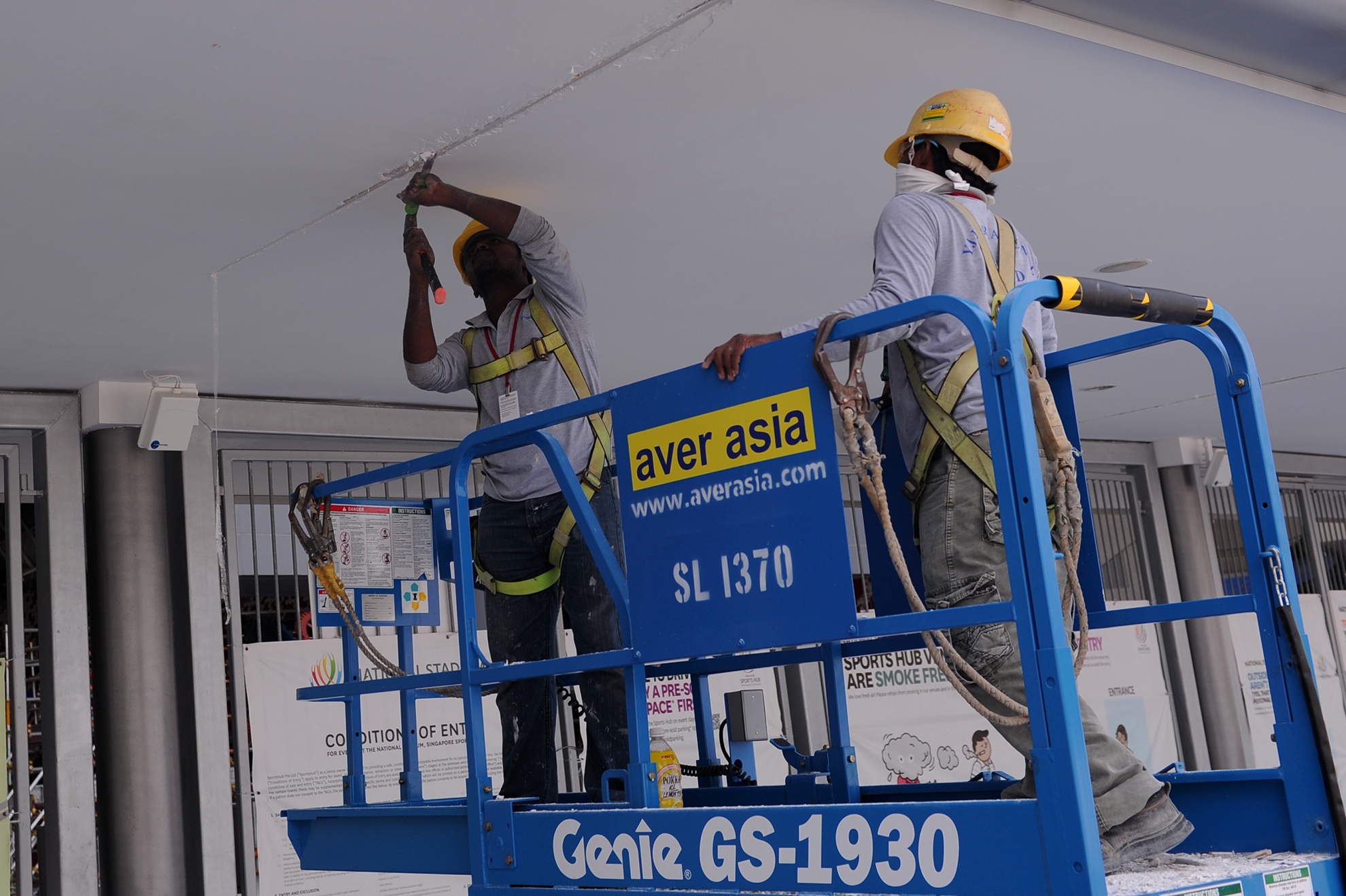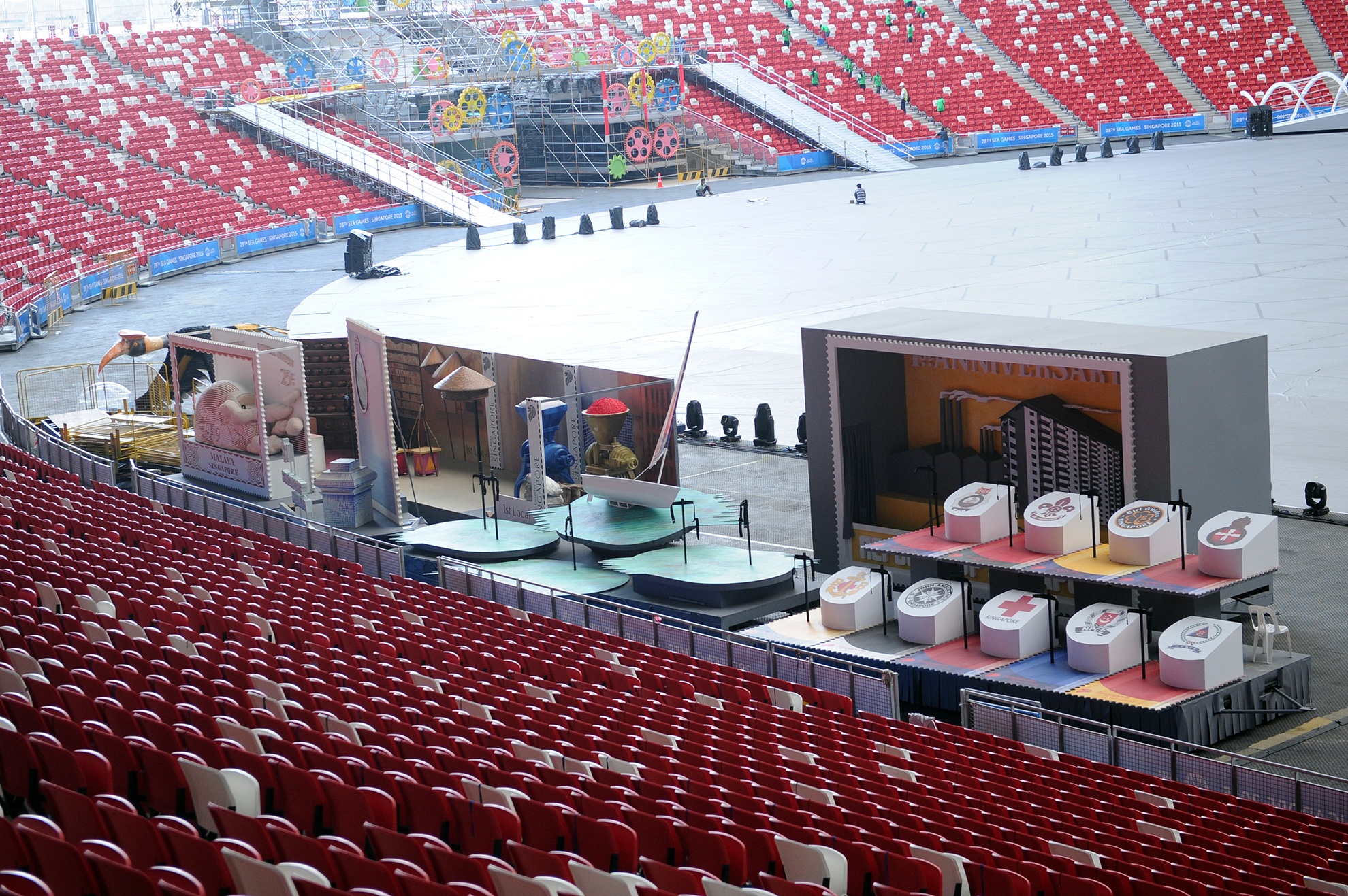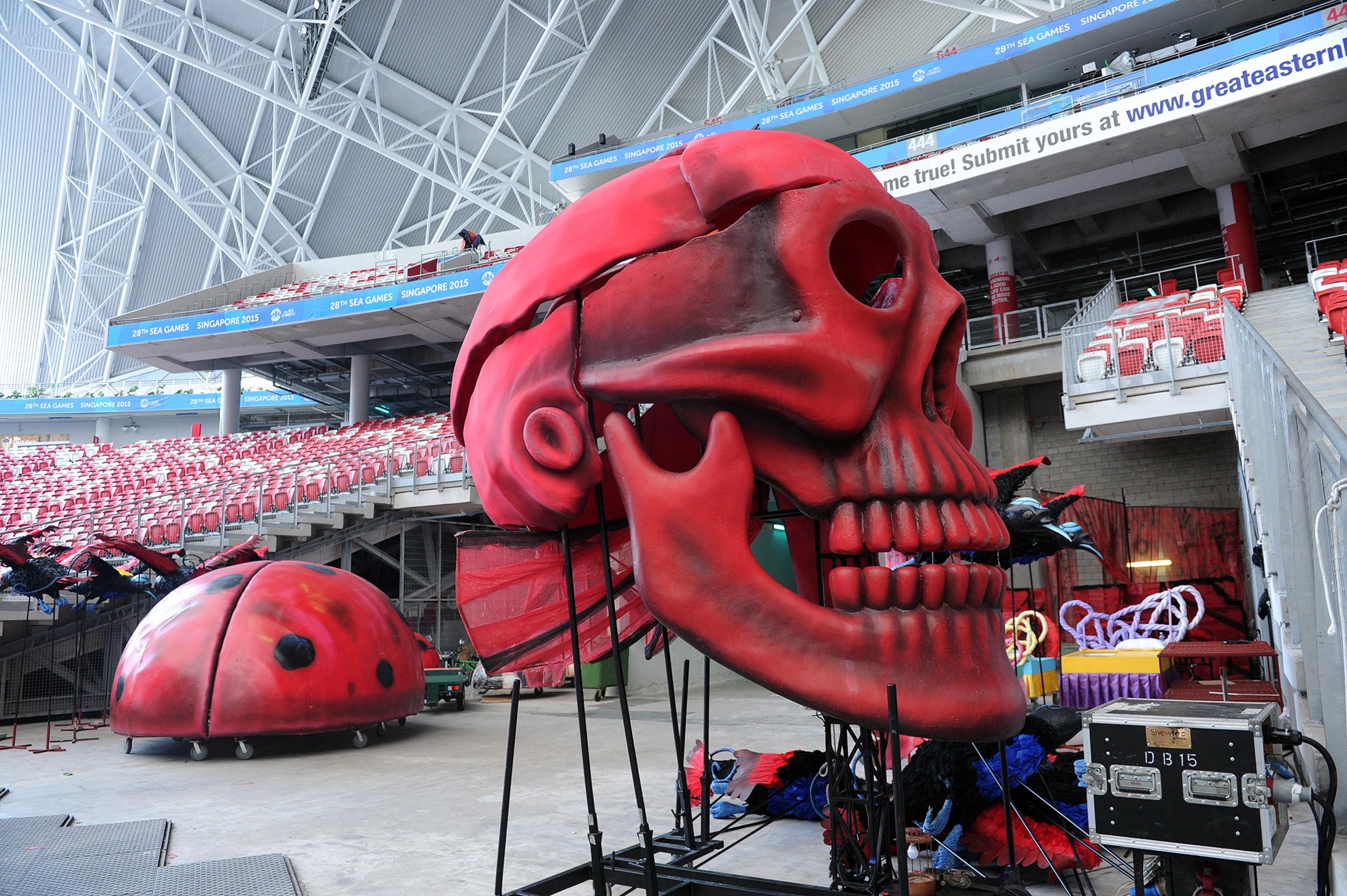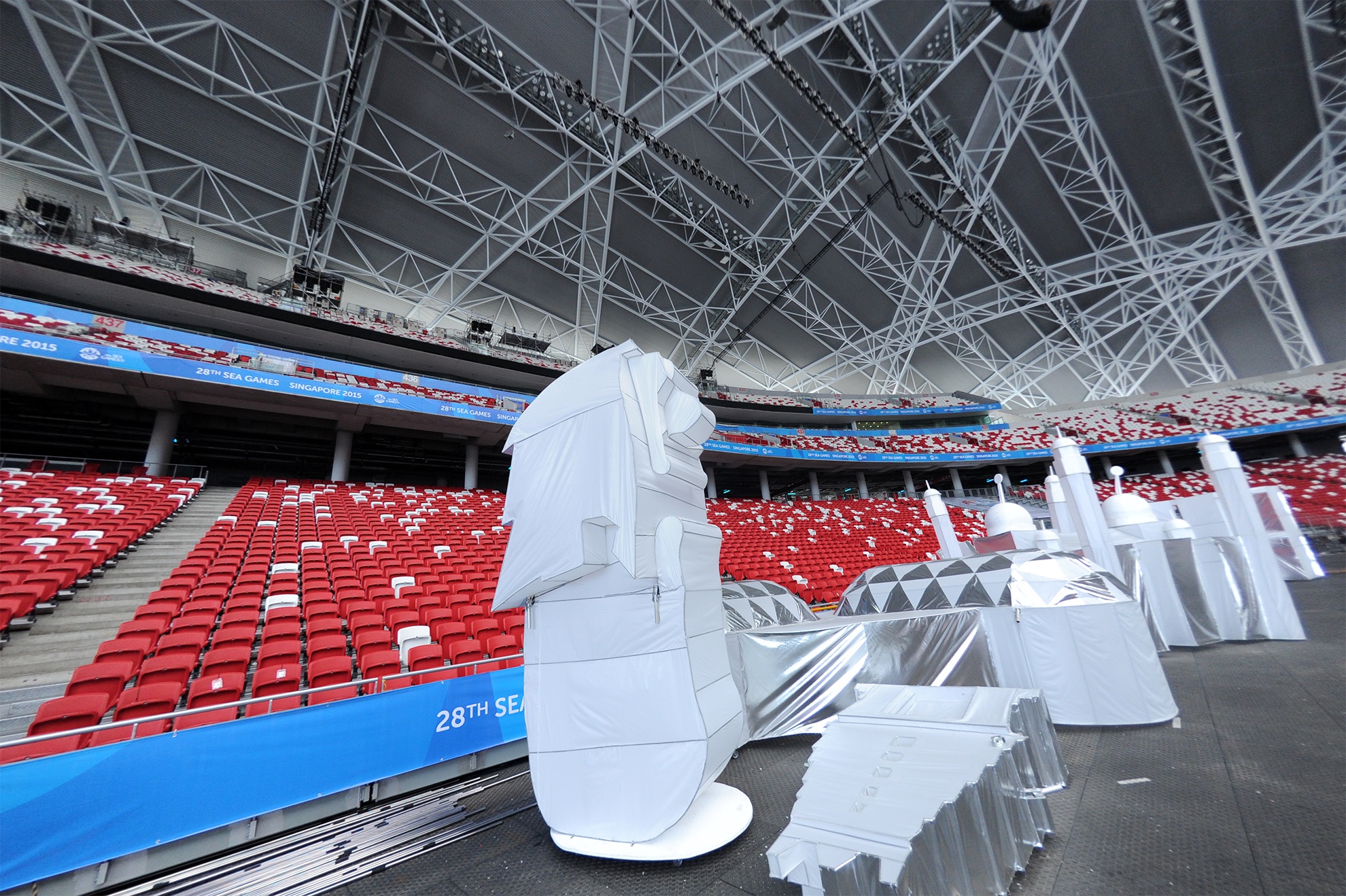 | Công tác chuẩn bị cho lễ khai mạc đang dần được hoàn thiện. Các mô hình biểu tượng của Singapore như tượng Sư tử mình cá Merlion, các toà nhà... đã được chuyển vào tập kết trong sân. |