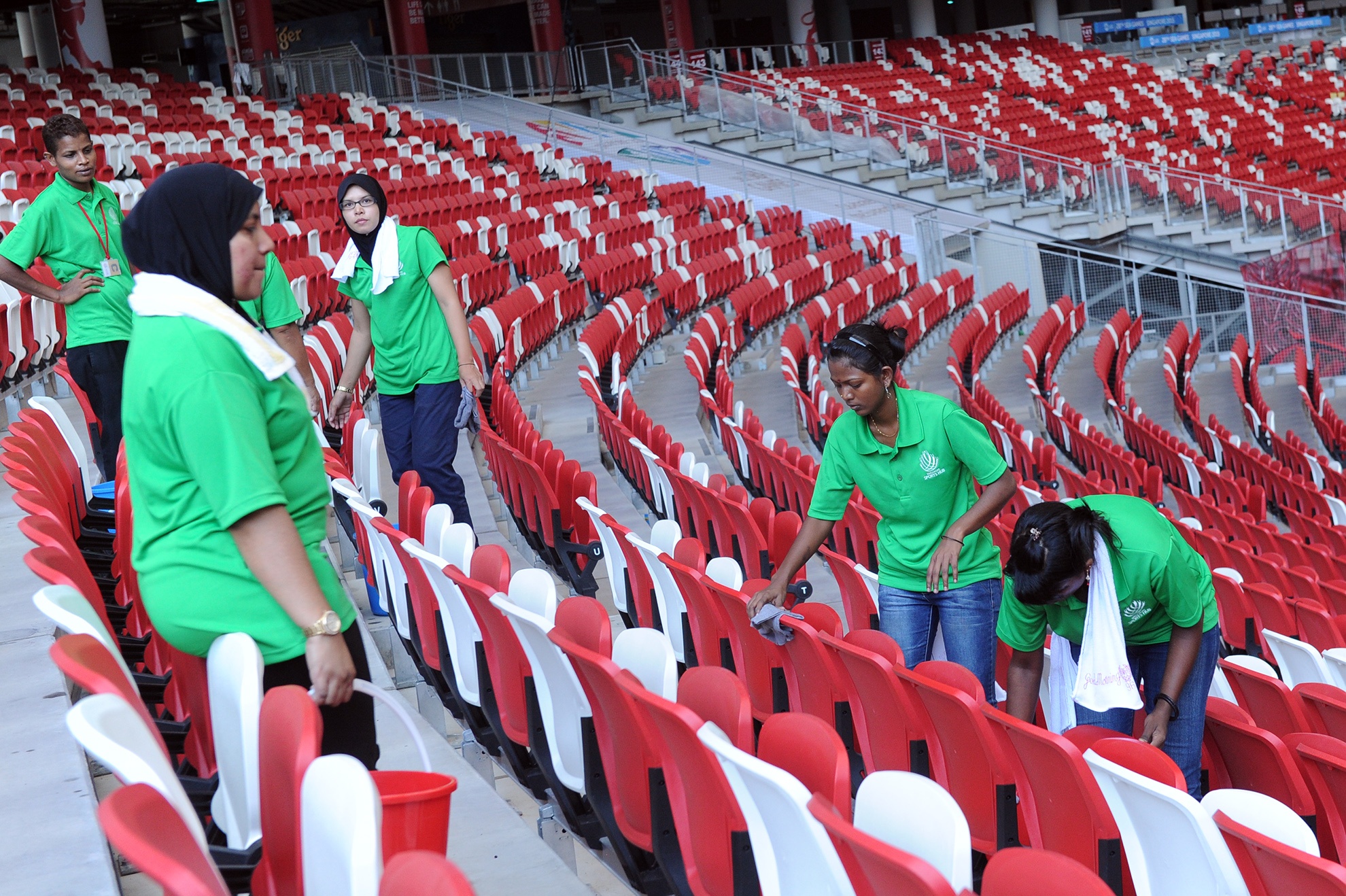 | Tình nguyện viên đang hoàn thiện nốt việc làm sạch 55.000 ghế ngồi. |
