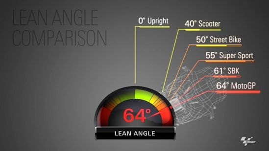 Nhiều khi các tay đua dường như sắp nằm ra đất, khiến chúng ta đôi khi rất hoài nghi về độ chân thực của nó. Nhưng đó là sự thực, kết hợp bởi cả các yếu tố công nghệ đỉnh cao với kỹ thuật lái xe siêu việt. Trong tình huống nghiêng xe để vào cua, những nghiên cứu đã đặt ra nhiều mức độ giới hạn của góc nghiêng các kiểu thức xe, tùy trong các môn đua xe khác nhau. Từ nghiêng nhẹ như xe tay ga đến mức sát đất như xe đua MotoGP. Giả sử nếu góc chạy xe chuẩn trên đường là 90 độ (xe chạy thẳng), để xe đạt được một góc nghiêng tối đa 64 độ, với tư thế như nằm trườn trên đường đua một nửa yếu tố phụ thuộc vào “rổ” máy tính công nghệ cao, phần còn lại là mức độ “điên cuồng” hơn kém của những tay lái MotoGP.