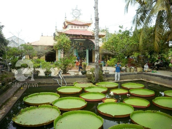 Loại sen khổng lồ mọc trong ngôi chùa cổ Phước Kiển (Đồng Tháp) có lá rộng đến 3m và có thể "cõng" được người nặng đến 80kg.