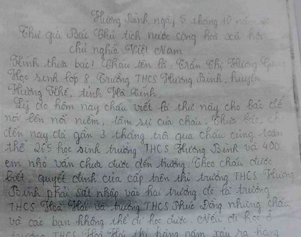 Lí do hôm nay cháu viết lá thư này cho bác để nói lên nỗi niềm, tâm sự của cháu. Thưa bác, cho đến hôm nay đã gần 3 tháng trôi qua cháu cùng toàn thể 265 học sinh trường THCS Hương Bình và 400 em nhỏ vẫn chưa được đến trường. Theo cháu được biết, quyết định của cấp trên thì trường THCS Hương Bình phải sát nhập vào hai trường đó là THCS Hòa Hải và THCS Phúc Đồng nhưng cháu và các bạn không thể đi học được.