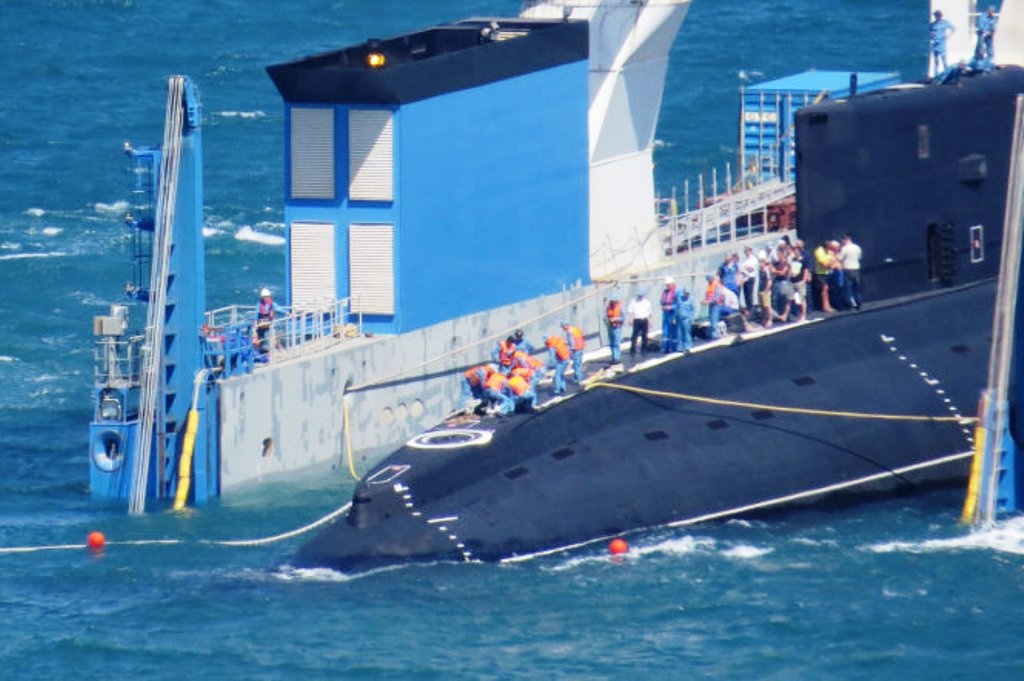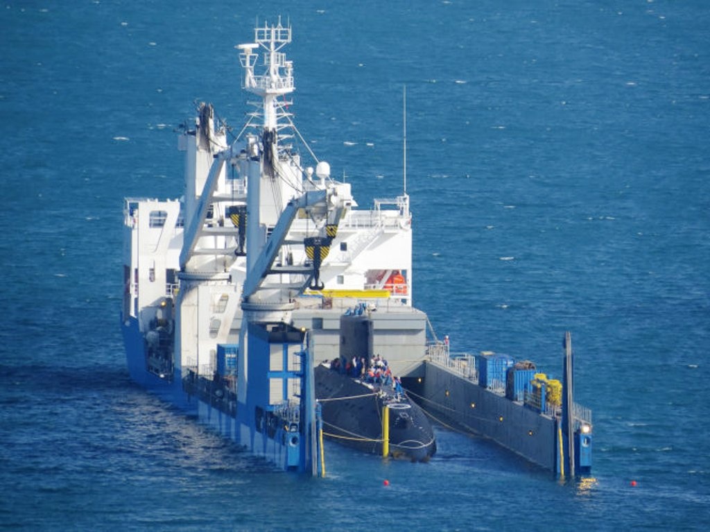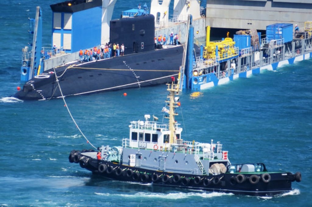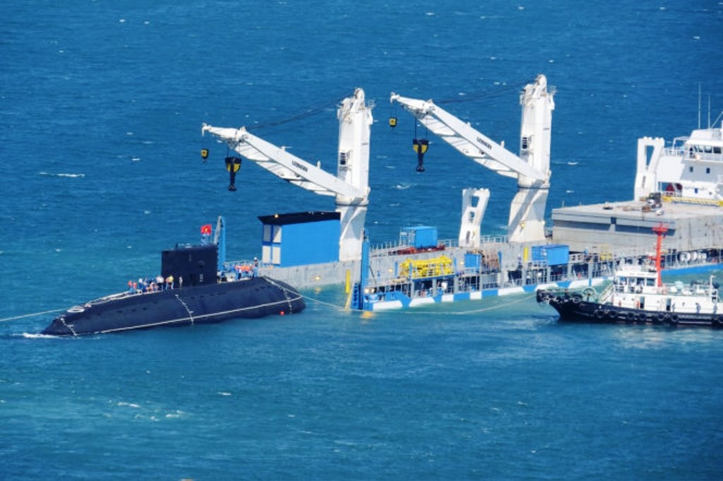 Đến 11h30, tàu ngầm kilo HQ-184 Hải Phòng được hai tàu Tân Cảng A1 và IMO 990 đưa ra khỏi tàu vận tải và kéo về bến cảng Lữ đoàn 189.