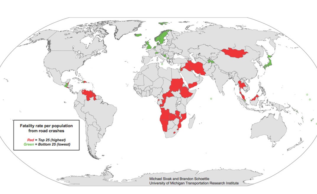 Cũng theo nghiên cứu trên, số người chết vì tai nạn ô tô trên toàn thế giới là 18/100.000 người. Đất nước an toàn nhất để lái xe khi ra đường là quốc đảo Maldives với chỉ 2/100.000 người chết. Đất nước có tình trạng giao thông tồi tệ và nguy hiểm cho lái xe là Namibia, với tỷ lệ người chết vì tai nạn ô tô lên tới 45/100.000 người. Mỹ xếp dưới mức trung bình một chút, với 14/100.000 người.