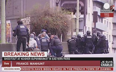 Phóng viên Telegraph đưa tin: "5 hoặc 6 xe cảnh sát đã đến hiện trường vụ xả súng tại cửa hàng thịt ở đông Paris. 2 trực thăng cũng đang lượn trên bầu trời. Cảnh sát rất đông trong khi kẻ bắt cóc con tin đang giữ khẩu súng Kalashnikov".