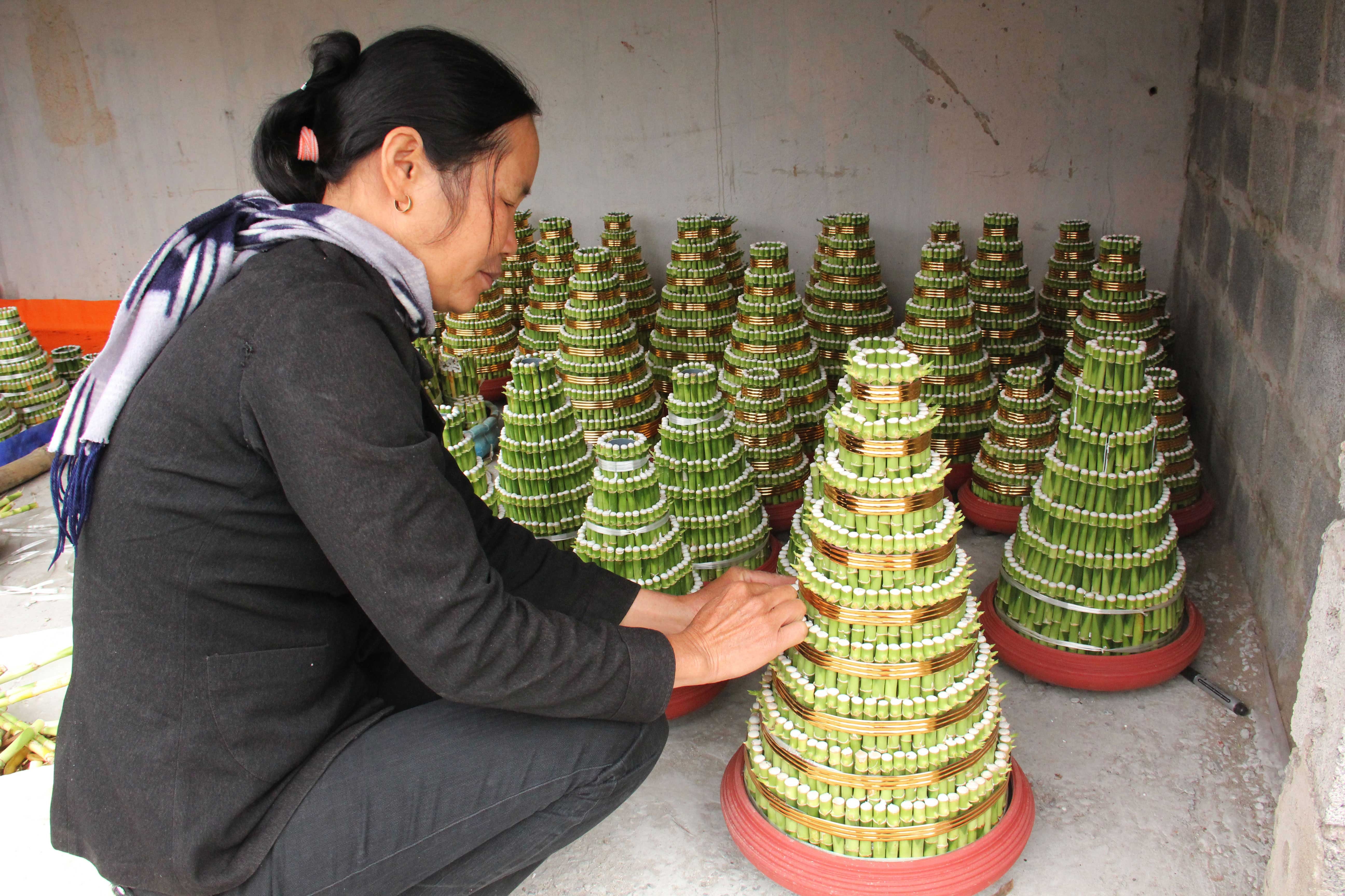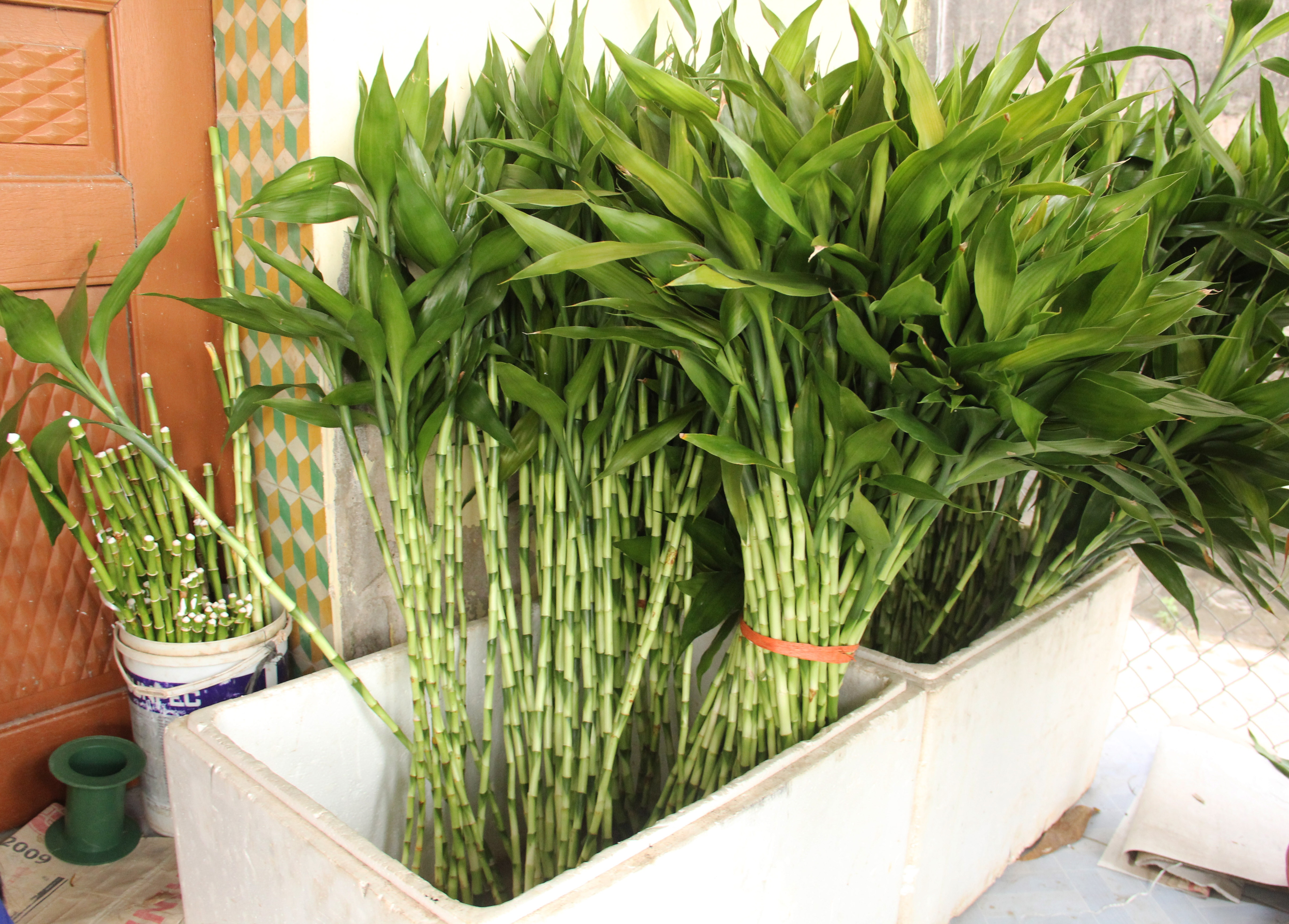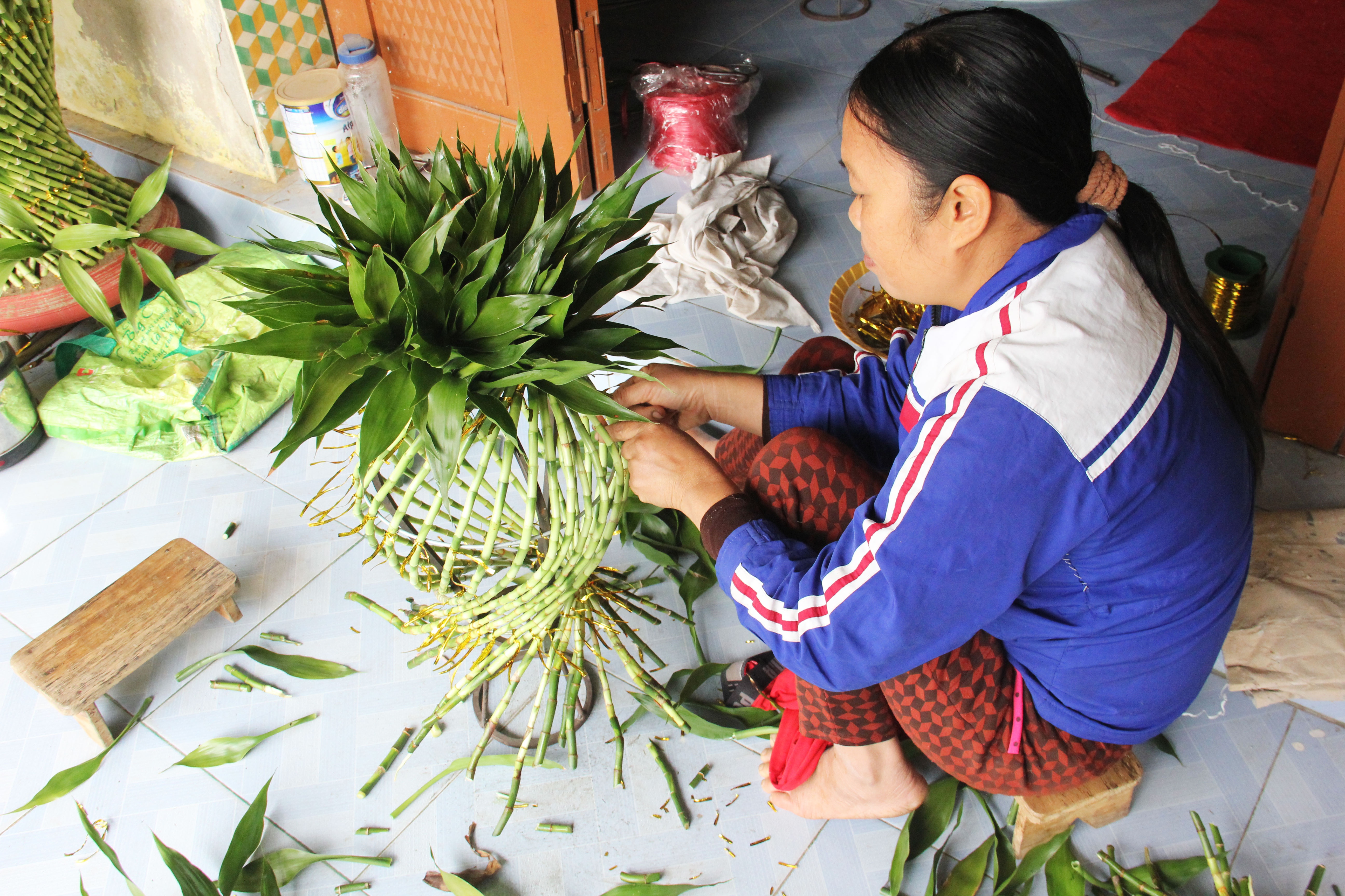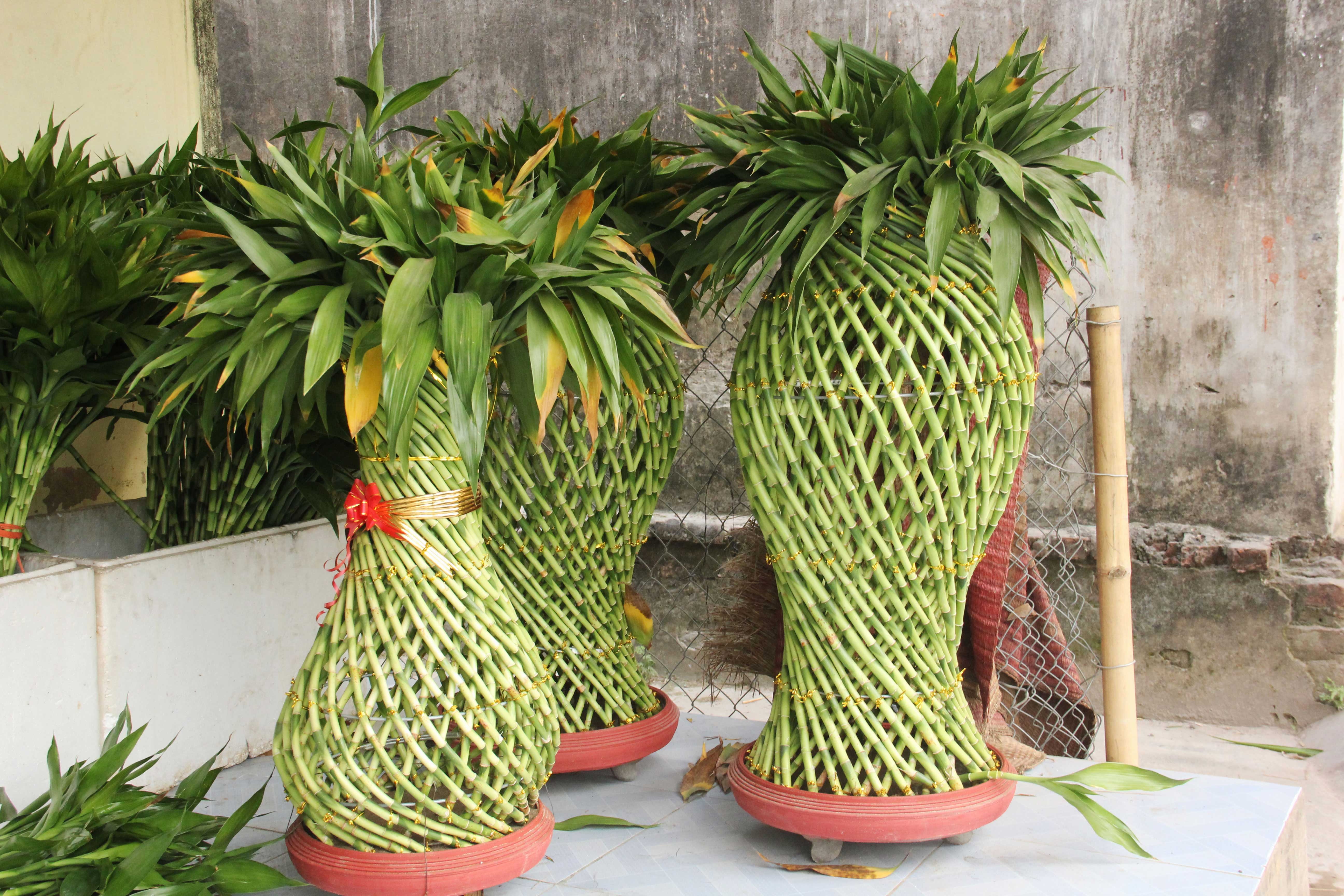 "Đầu tiên, phải chọn làm sao cho các thân cây to bằng nhau, già đều, để khi làm bình mới không bị gãy. Khi xếp cây, các mắt ở thân phải quay ra ngoài và theo một hướng nhất định. Riêng chậu phát lộc phải làm trước Tết khoảng 2-3 tháng, để cây có thời gian nảy lộc, cách làm cũng phức tạp hơn. Theo đó, giá cũng cao hơn 30.000-50.000 đồng/chậu", chị Cúc chia sẻ.