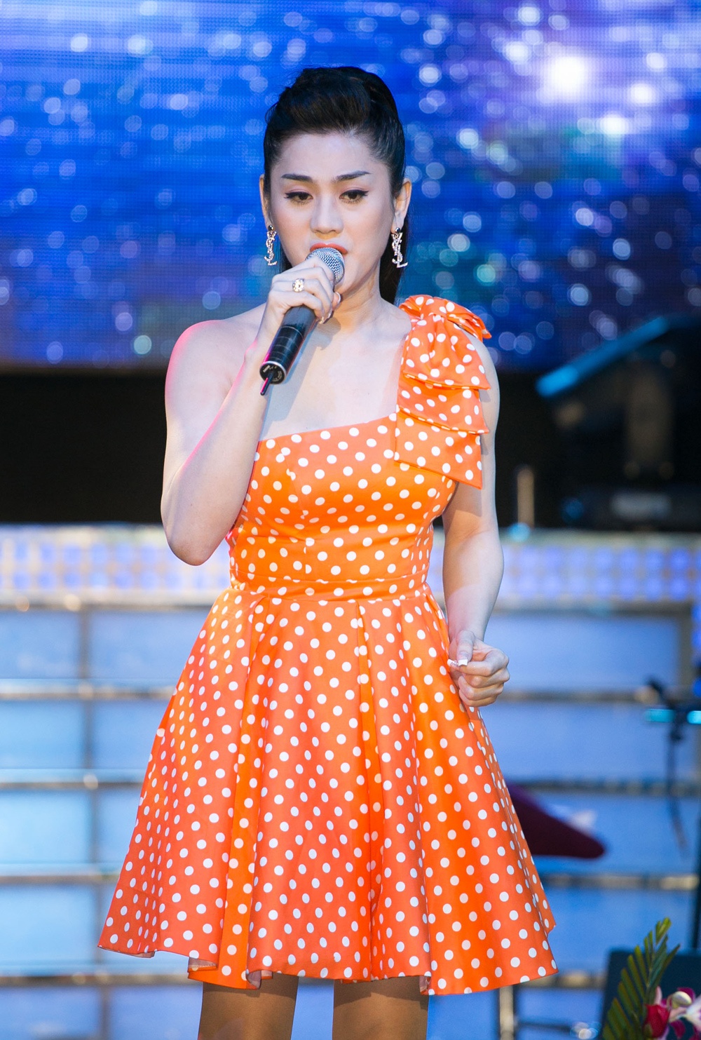 | Trong khi đó, Lâm Chi Khanh trông gợi cảm với chiếc đầm chấm bi màu cam rực rỡ, phù hợp với phong cách nữ tính của người đẹp. Trở về 3 cũng chính là vai diễn đầu tiên của Lâm Chi Khanh. Ca sĩ chuyển giới vô cùng thích thú khi nhận được một vai diễn khá giống với mình ngoài đời. |