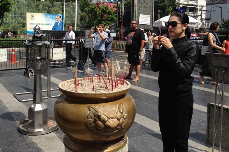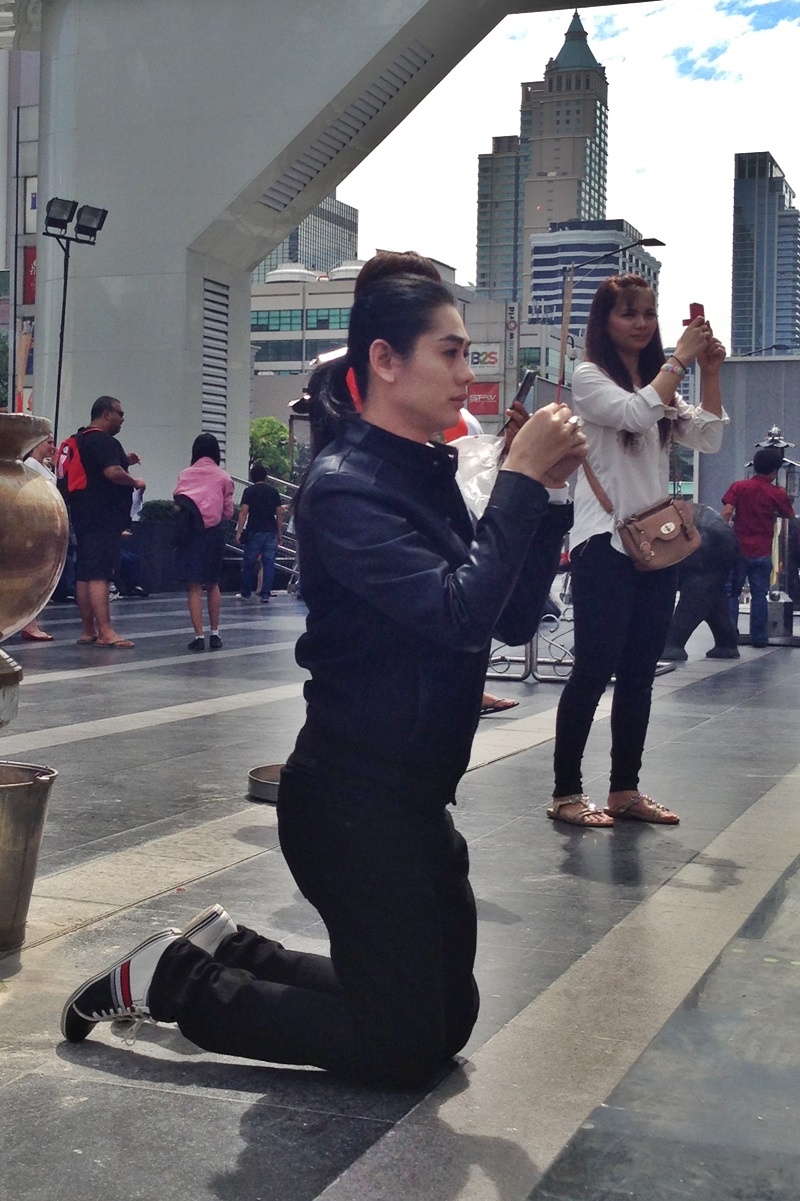 | Trong cảnh quay này, Lâm Chi Khanh với tạo hình là một chàng trai đang thắp hương cầu nguyện trước khi bấm máy. |
