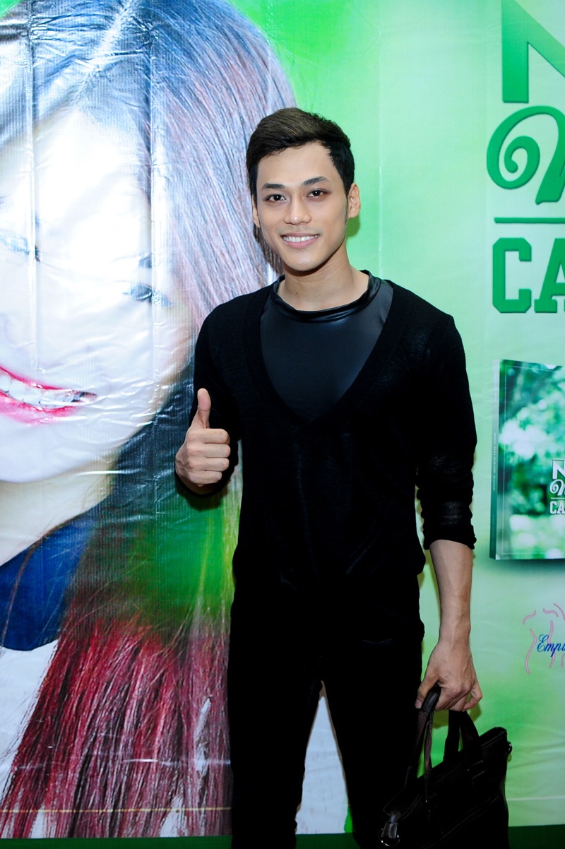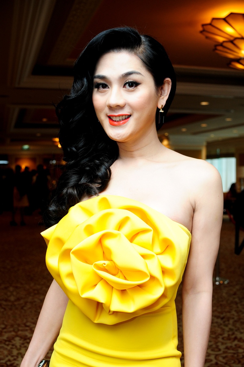 Nữ ca sĩ chuyển giới xuất hiện với bộ váy vàng điểm nhấn là bông hoa to giữa ngực, trang điểm đậm, đến mừng Cao Thái Sơn phát hành album Vol.11 "Như hai người dưng" tại TP.HCM.