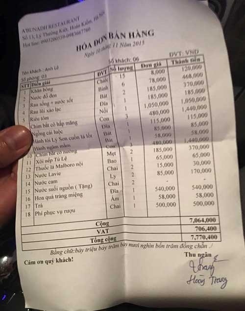 "Nhà hàng có rất nhiều món ngon dành cho khách VIP như tôm hùm, cua hoàng đế, bào ngư... Nhưng với mức 1 triệu đồng mỗi người, khách cũng chỉ có thể thưởng thức được những món đặc sản phổ biến. Vì vậy, gần 8 triệu đồng cho 4-6 người ăn là bình thường. Đối với khách cao cấp, chúng tôi còn có khung giá lên tới vài ba trăm USD/người", quản lý nhà hàng chia sẻ.