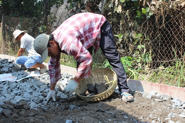 | Công nhân làm đường vào nhà mẹ Em. Ảnh: T.K |