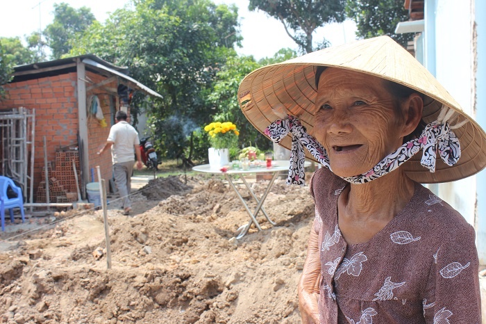 Bên móng căn nhà mới đổ, bà Oanh cười tươi và nói nhà cũ đã hư hỏng, nhiều lần mong trúng số để có tiền trả. "Bất ngờ Bí thư Thăng đến thăm và chỉ đạo làm lại nhà cho mẹ, tôi biết ơn lắm", bà Oanh nói.