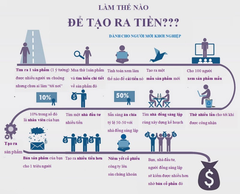 Tổ chức khởi nghiệp Funders and Founders của Mỹ đã tạo ra một infographic mô tả lại quá trình đi từ ý tưởng, trải qua các bước để đưa công ty trở thành công ty đại chúng của các tỷ phú đô la. Infographic này lấy ý tưởng từ bài luận nổi tiếng "Làm thế nào để bắt đầu khởi nghiệp" của nhà đầu tư mạo hiểm kiêm lập trình viên Paul Graham.
