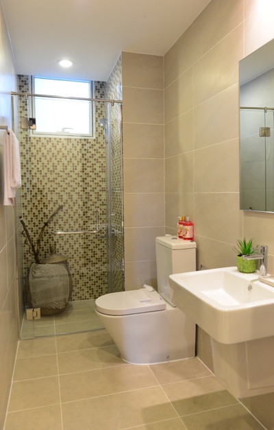 Mảng gạch men ốp tường khác màu với sắc chủ đạo của phòng tắm tạo cảm giác thư thái.