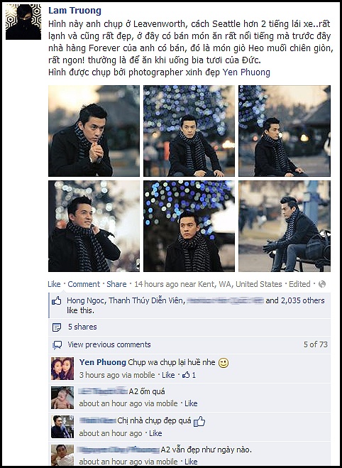 | Sau khi Lam Trường đăng tải hình ảnh do người vợ trẻ chụp, Yến Phương bình luận ngay phía dưới: "Chụp qua chụp lại huề nha". Ít người biết rằng anh Hai cũng từng chụp rất nhiều hình đẹp cho vợ 9X. |