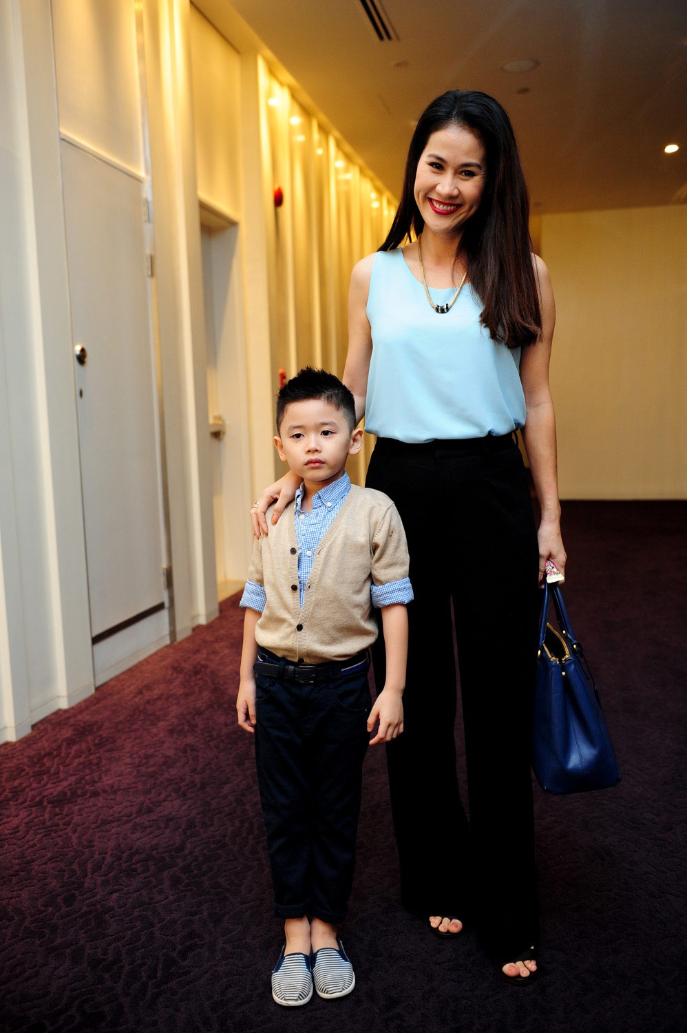 | Người đẹp Thân Thúy Hà đi cùng con trai. Sau khi ly hôn, cô ở một mình nuôi con và tập trung vào sự nghiệp phim ảnh. |