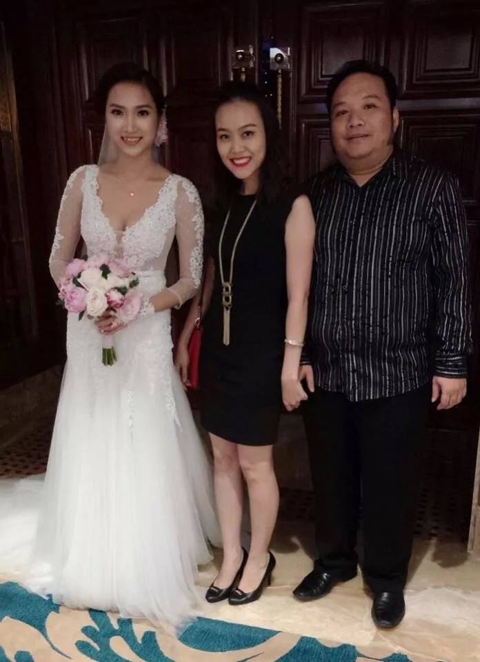 | Vợ chồng Đoan Trang trốn con gái đi dự tiệc cưới của đồng nghiệp. Cặp đôi còn dùng điện thoại để chụp hình lưu niệm trong hôn lễ. |
