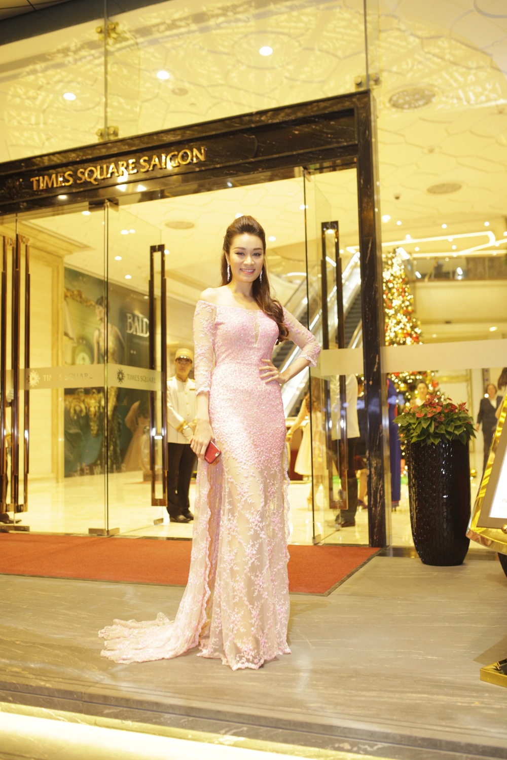 | Minh Thư diện đầm hồng xuyên thấu, vai trễ tôn vẻ nữ tính của cô.Trong hôn lễ tối 27/11, cô và mẹ đến chúc mừng cậu tìm được bến đỗ mới. |