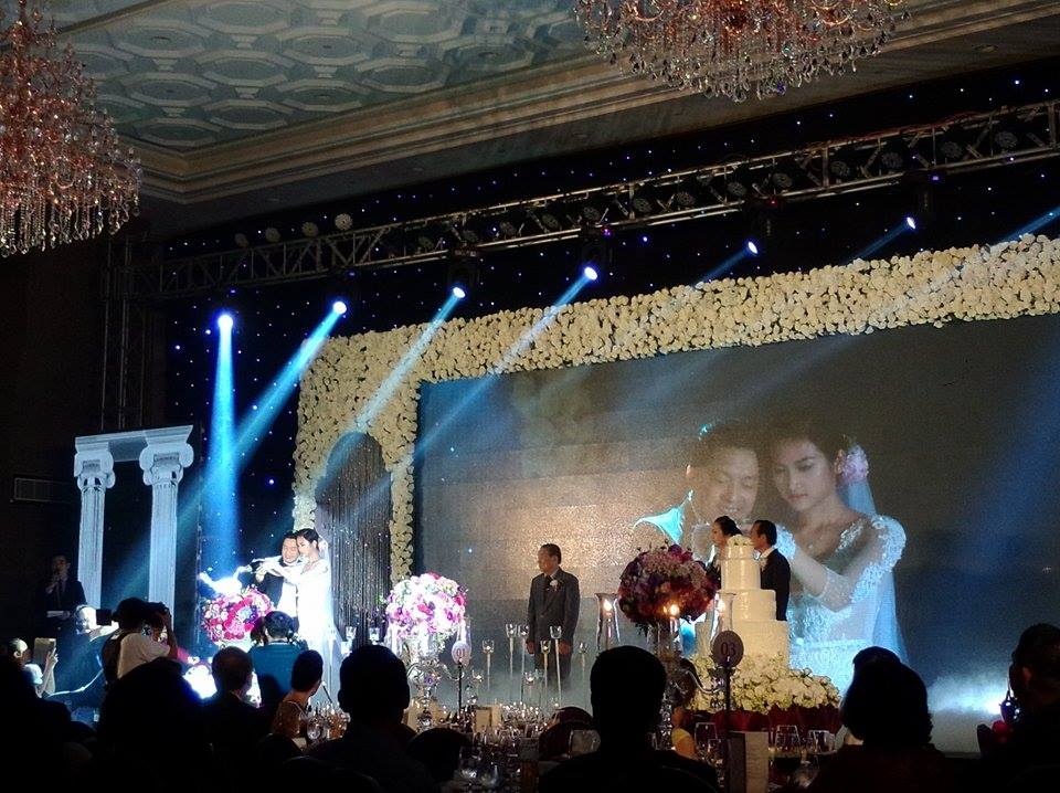 | Sau khi làm lễ, hình ảnh cô dâu chú rể rót sâm banh được chiếu trên màn hình lớn. Yến Phương không giấu được xúc động trong tiệc cưới sang trọng. |