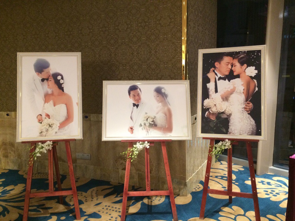 | Những tấm hình cưới của Lam Trường và Yến Phương chụp trong studio được đóng khung, treo trên giá gỗ ở khắp mọi góc của khán phòng. |