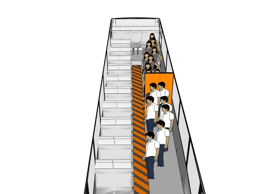 3. Phân chia khu vực đứng thành hai khu nam nữ bằng vách ngăn nhẹ. Với đề xuất này, hành khách sẽ có diện tích đứng thoải mái hơn.